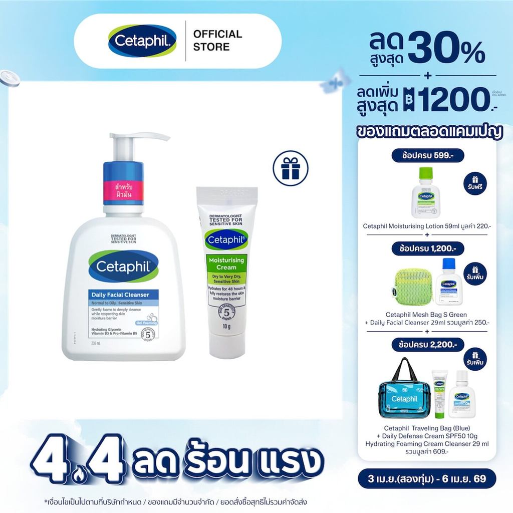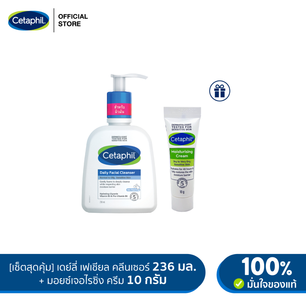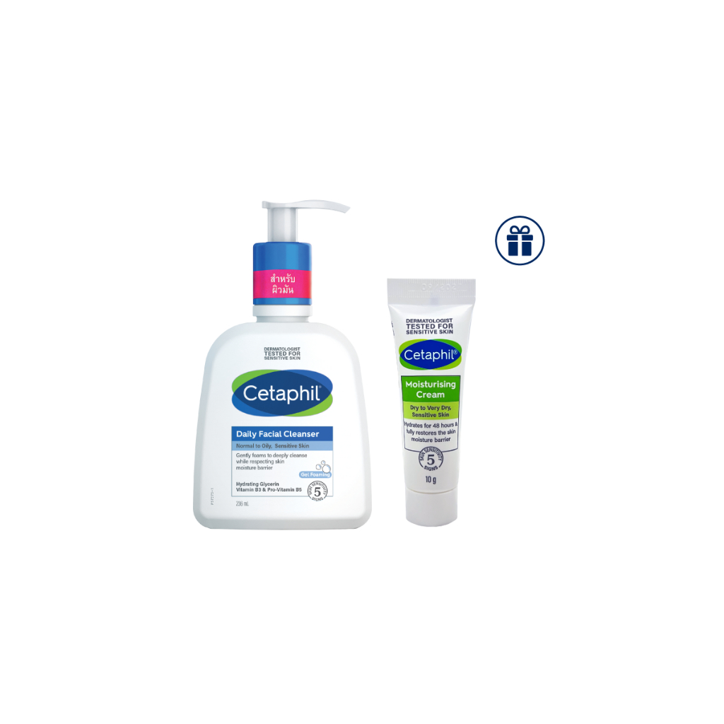 [เซ็ตสุดคุ้ม] Cetaphil Daily facial cleanser เซตาฟิล เดย์ลี่ เฟเชียล คลีนเซอร์ 236 ml แถมฟรี Moisturising Cream 10g