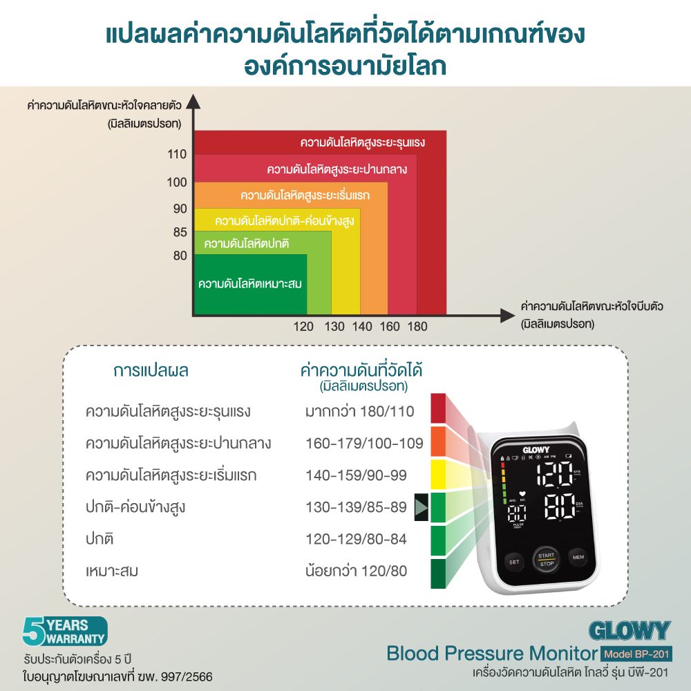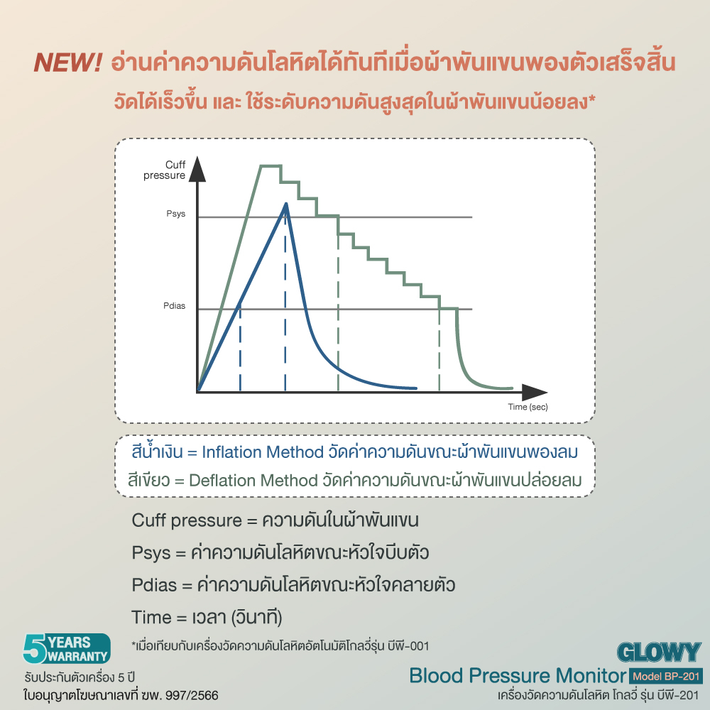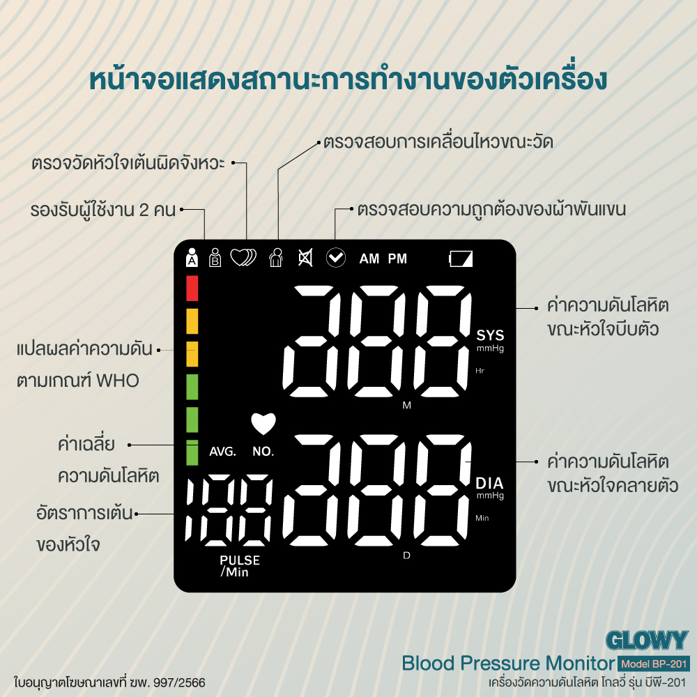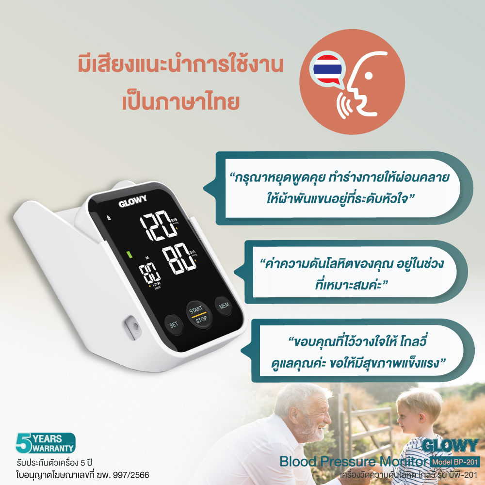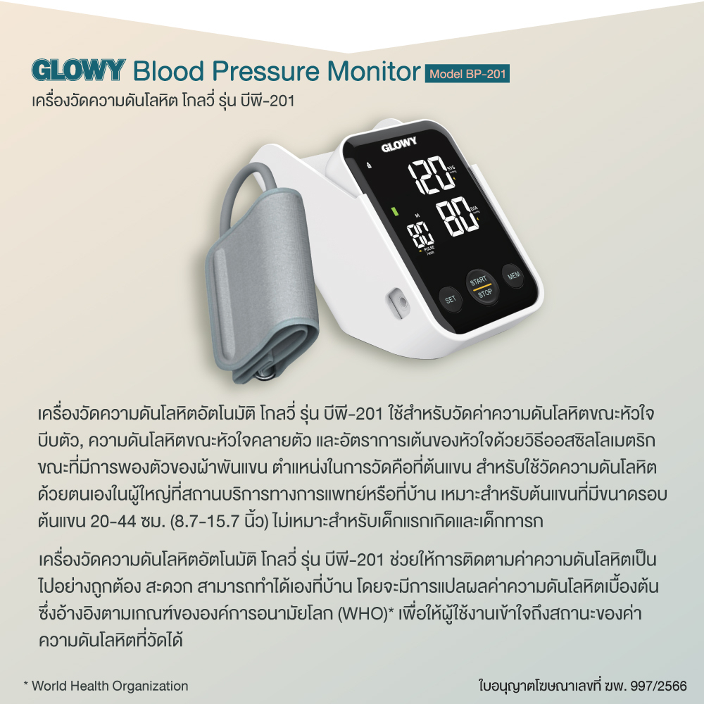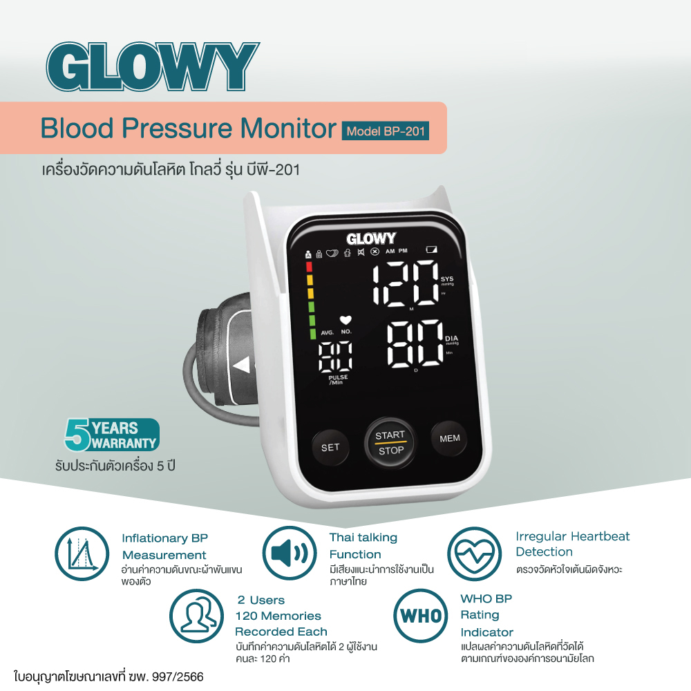 GLOWY เครื่องวัดความดันโลหิตอัตโนมัติ โกลวี่ รุ่น บีพี 201 Glowy Blood Pressure Monitor Model BP 201