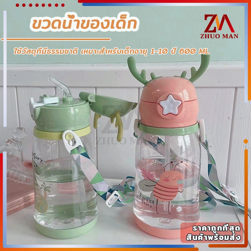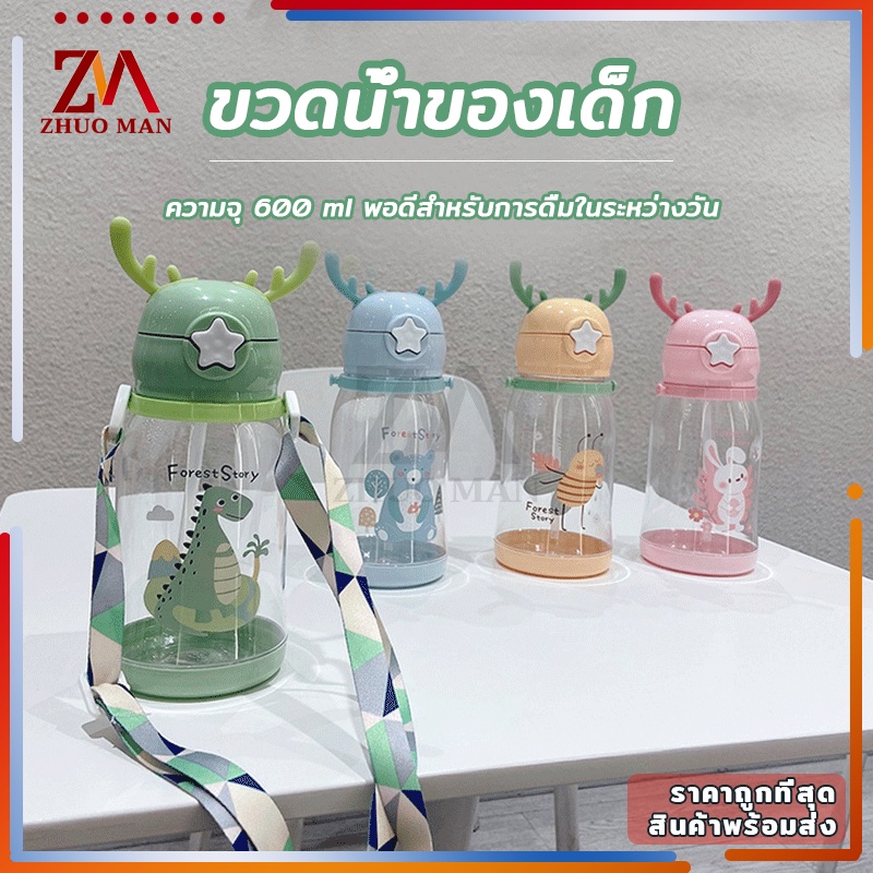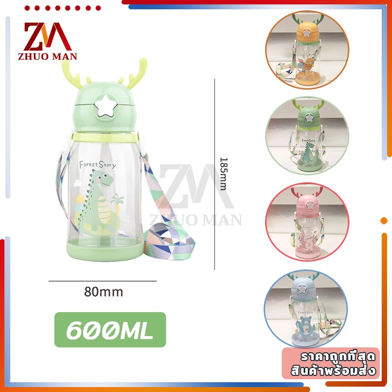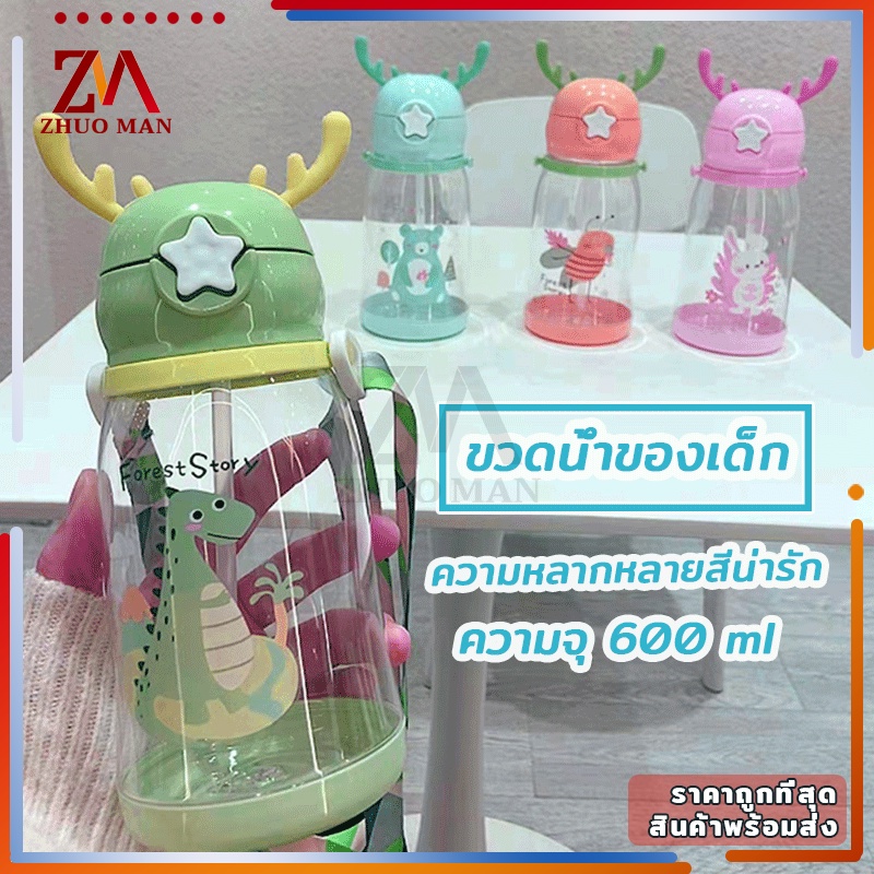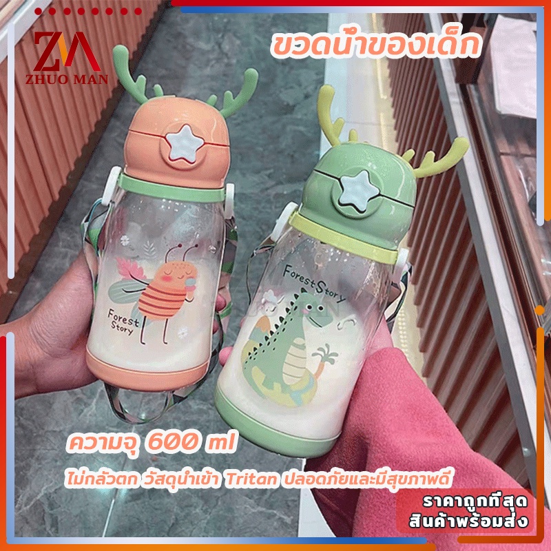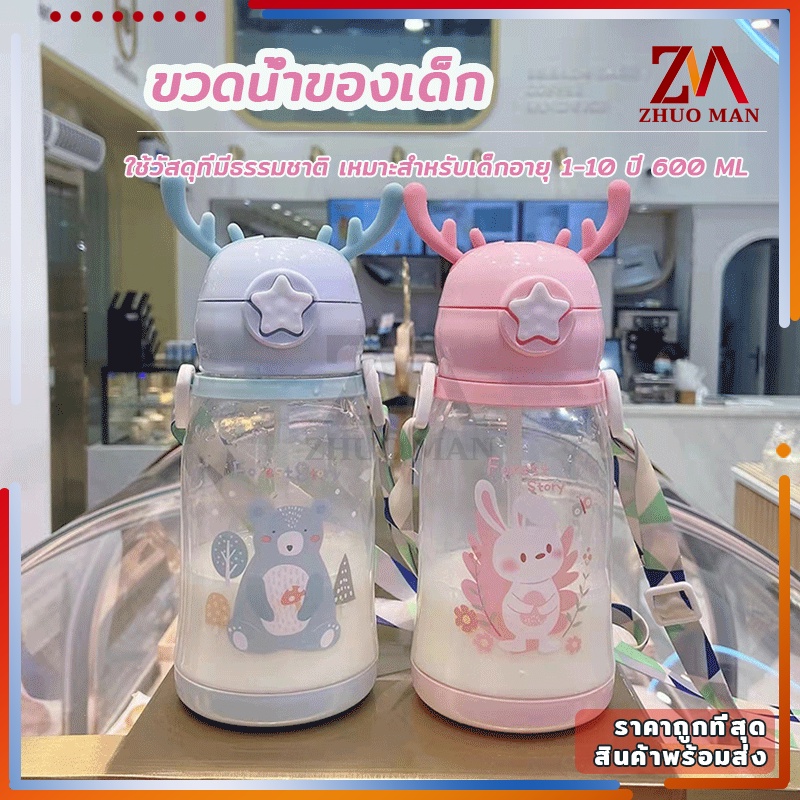ขวดน้ำของเด็ก กระติกน้ำ พร้อมหลอดดูด ขวดน้ำ เขากวางอ่อนซิลิโคนน่ารัก ความจุขนาดใหญ่ 600มล การออกแบบสายรัดพกพาสะดวก