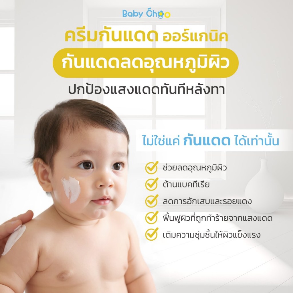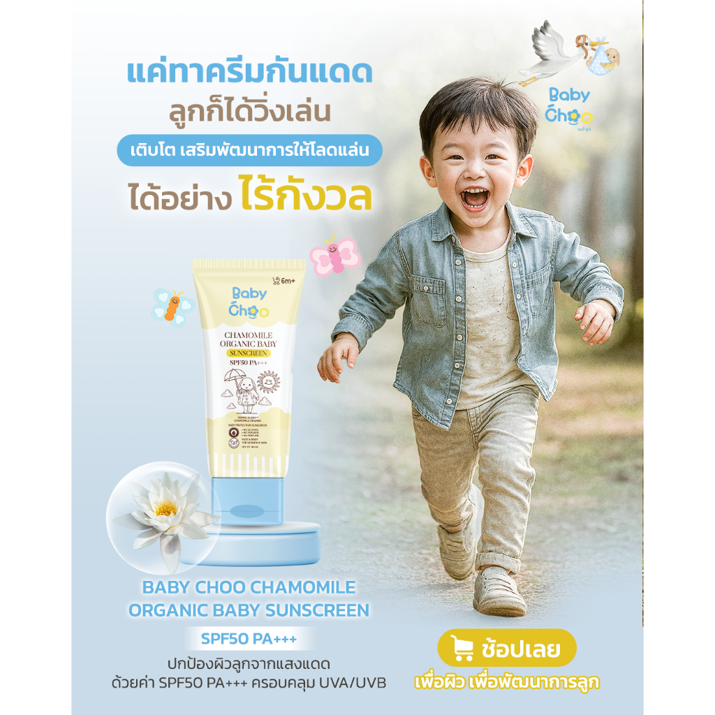 [โปร 2 ชิ้น] Baby Choo กันแดดสำหรับเด็ก ผิวนุ่มชุ่มชื้น อ่อนโยน เนื้อบางเบา Chamomile Organic Baby Sunscreen SPF50 PA++
