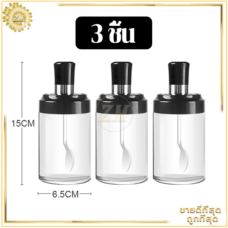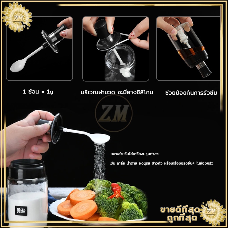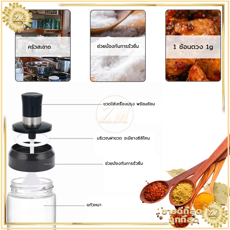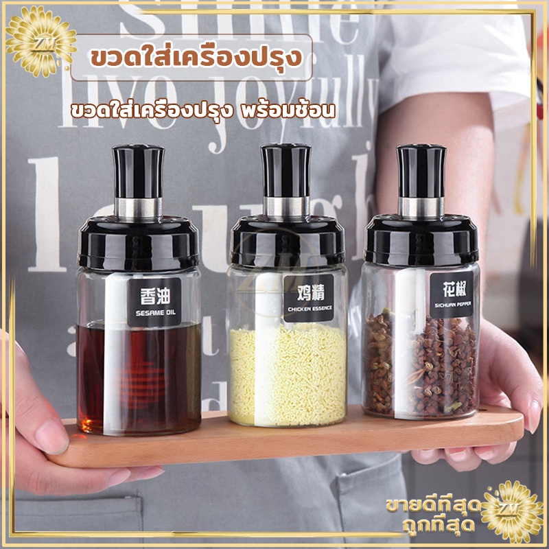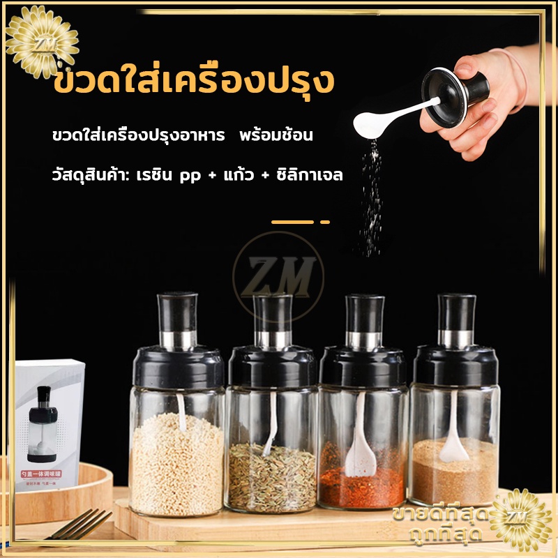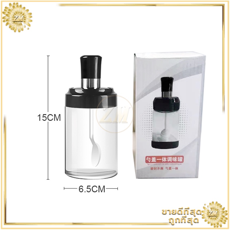 ขวดใส่เครื่องปรุง ด้วยช้อน เครื่องครัว ฝาปิด ใช้งานง่าย สะดวก ช้อนและฝาในตัวแก้วหนากันอากาศได้ดี