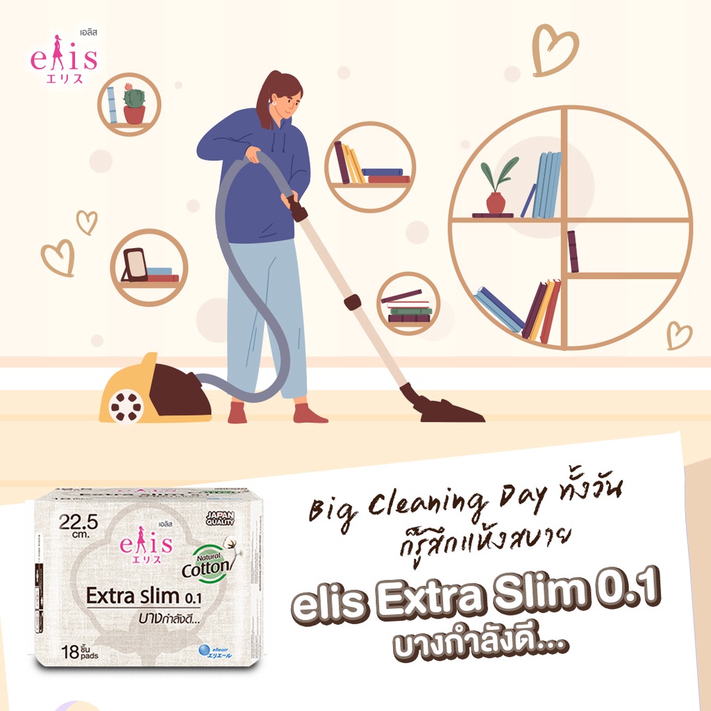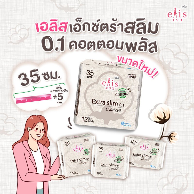 ผ้าอนามัย Elis Extra Slim 0.1 Cotton Plus เอลิส เอ็กซ์ตร้าสลิม 0.1 คอตตอน พลัส แบบกลางวัน-กลางคืนมีปีก