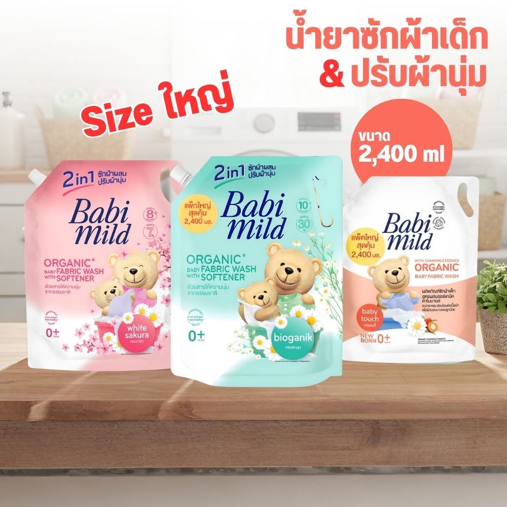 BabiMild น้ำยาซักผ้าเด็กผสมปรับผ้านุ่ม เบบี้มายด์ Sizeใหญ่ สุดคุ้ม ซักมือ/ซักเครื่อง 2400ml