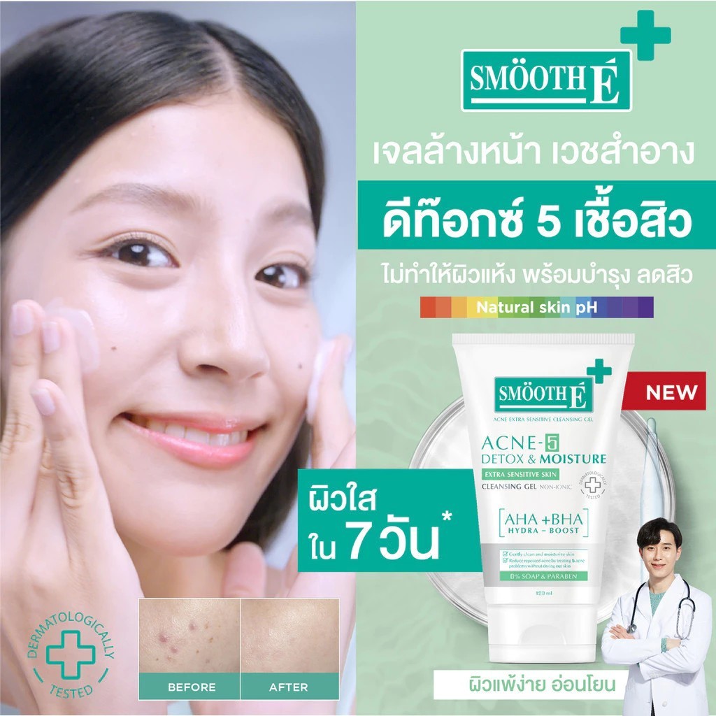 Smooth E Acne-5 Detox & Moisture Extra Sensitive Cleansing Gel 120 ml. เจลใสล้างหน้ารักษาสิว ผิวแพ้ง่าย ขจัดความมัน