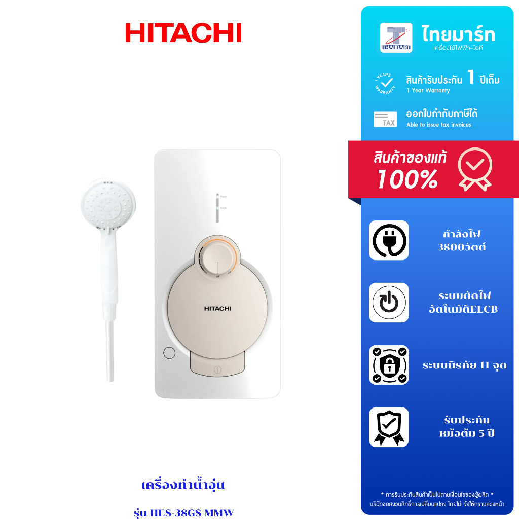 HITACHI เครื่องทำน้ำอุ่น 3800 วัตต์ รุ่น HES-38GSMMW (รับประกันศูนย์ 5 ปี)