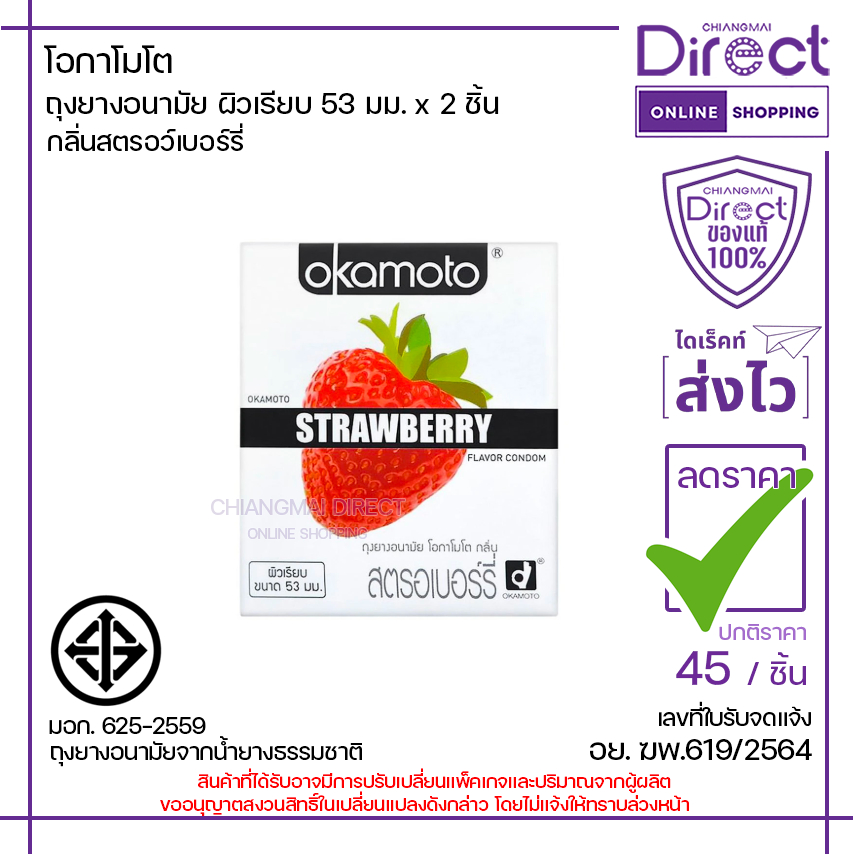 โอกาโมโต ถุงยางอนามัย สตรอว์เบอร์รี่ ผิวเรียบ 53 มม. 2 ชิ้น | 12530 [ไม่ระบุชื่อสินค้าหน้ากล่อง]