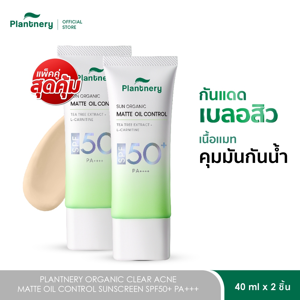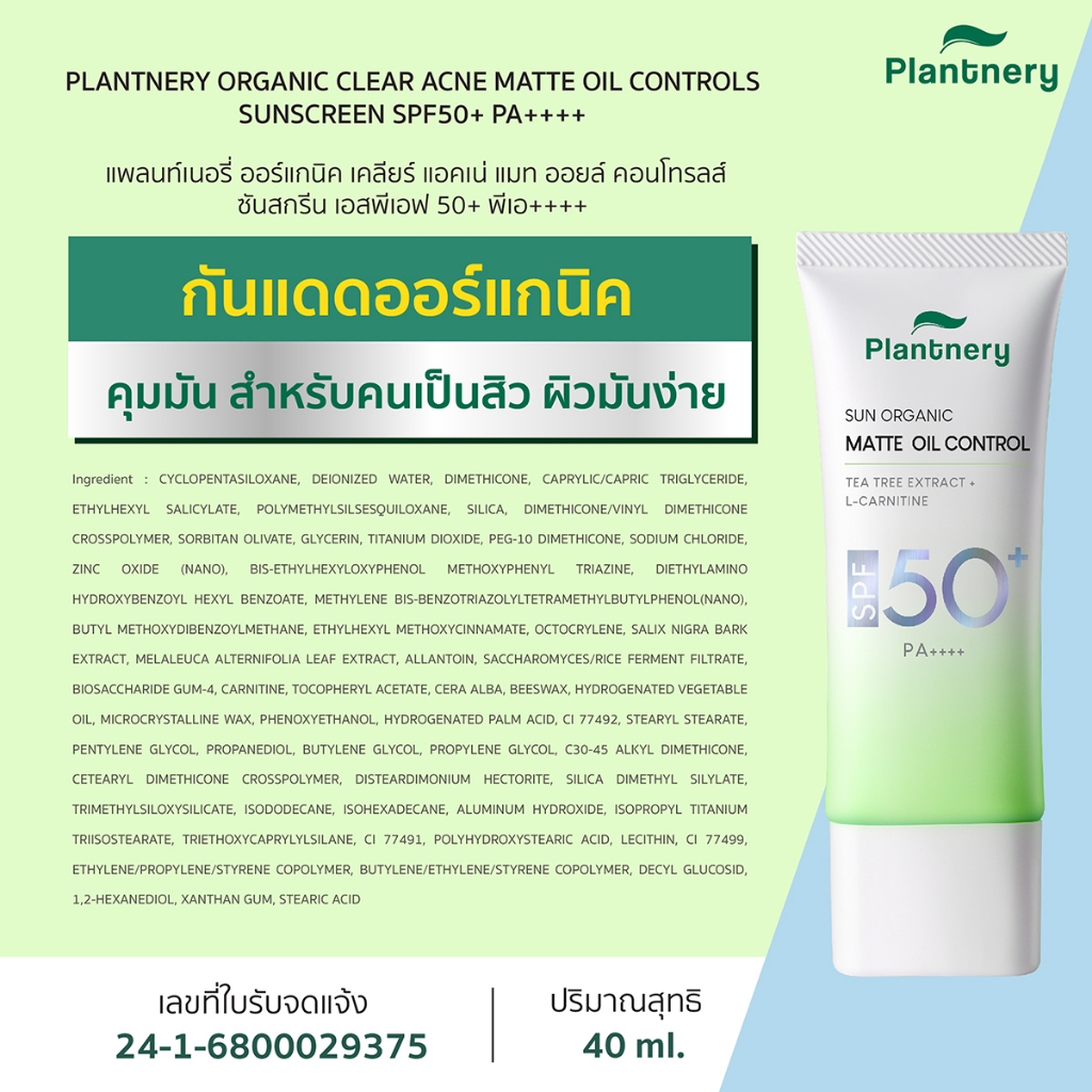 Plantnery Organic Clear Acne Matte Oil Control Facial Sunscreen SPF50+ PA+++ 40 ml กันแดดเนื้อแมต คุมมัน กันน้ำ ปัญหาสิว