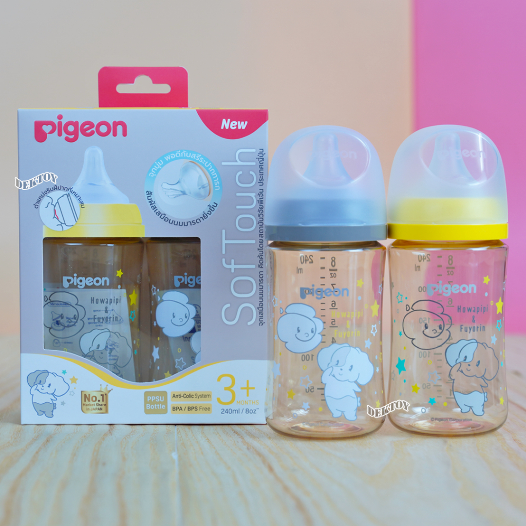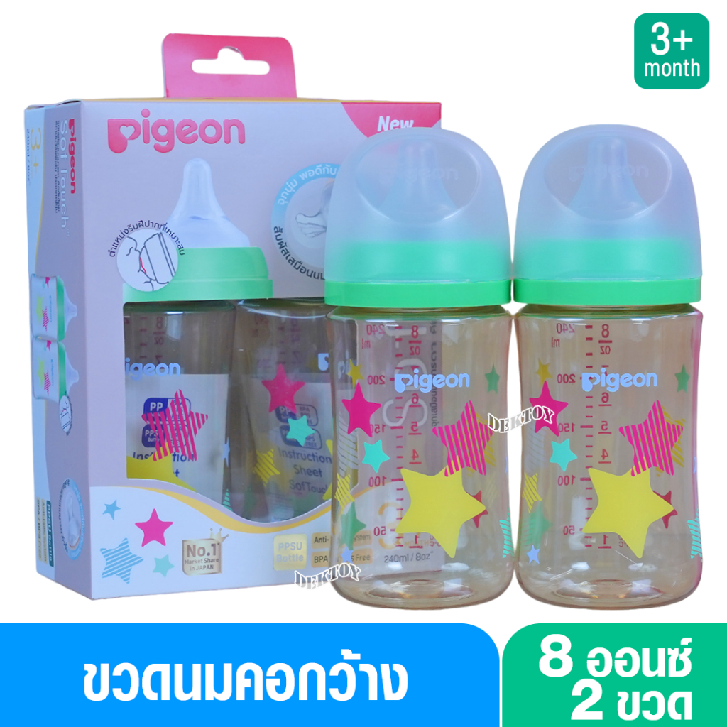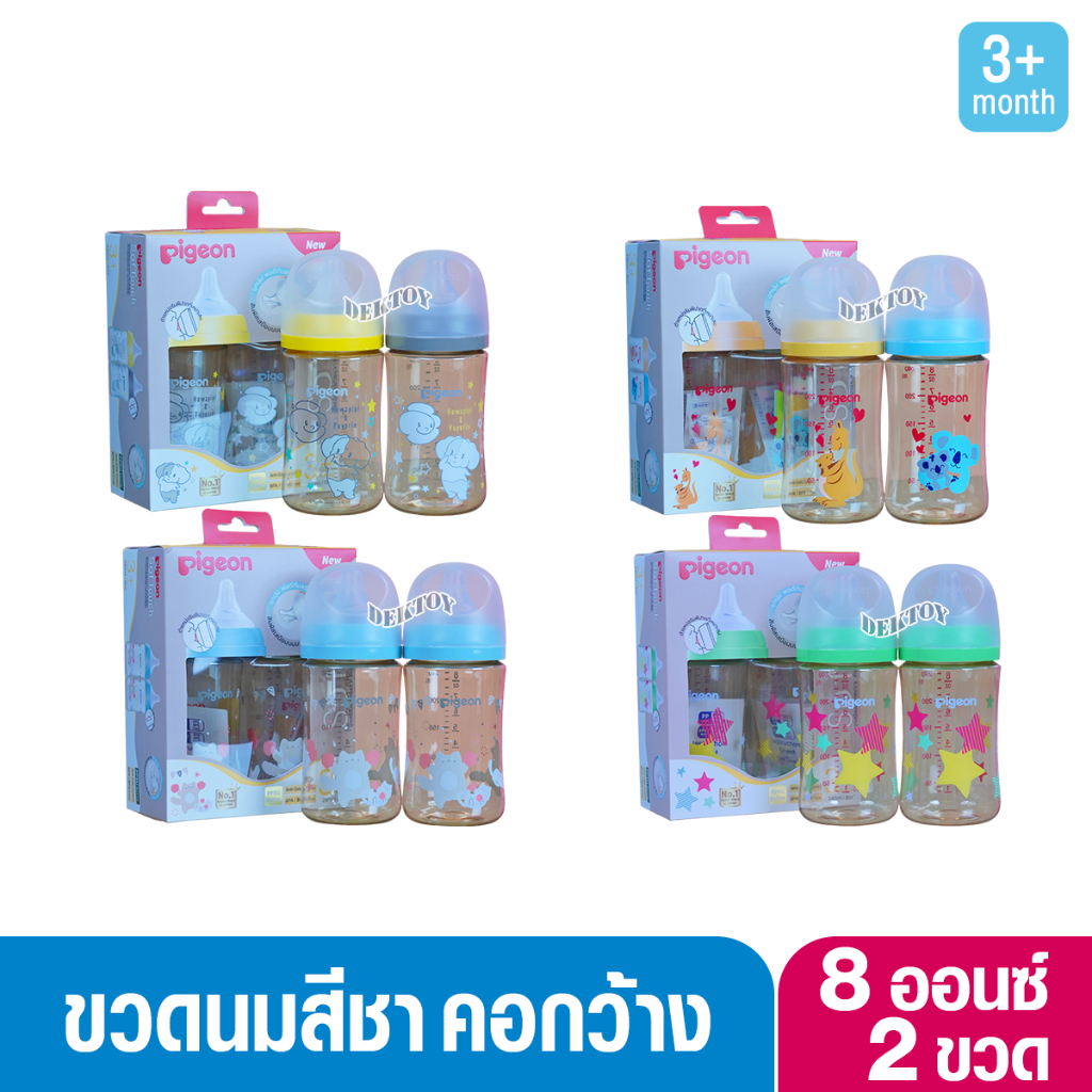 รุ่นใหม่ Pigeon พีเจ้น ขวดนมพีเจ้นสีชา 8 ออนซ์240มล.แพ็ค2ขวด+ จุกซอฟท์ทัช พลัส M