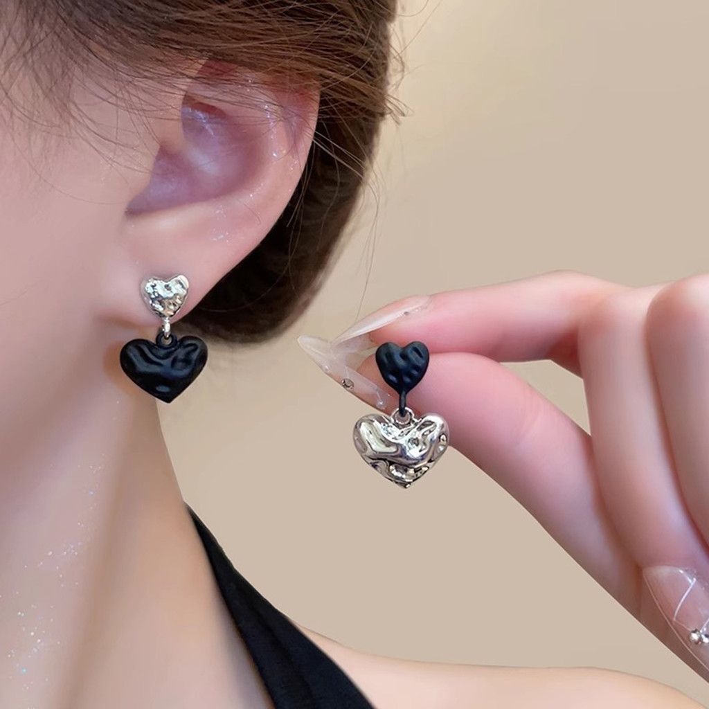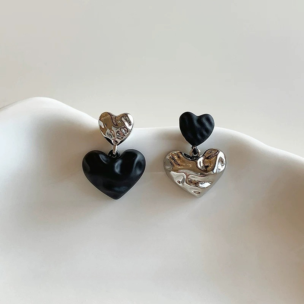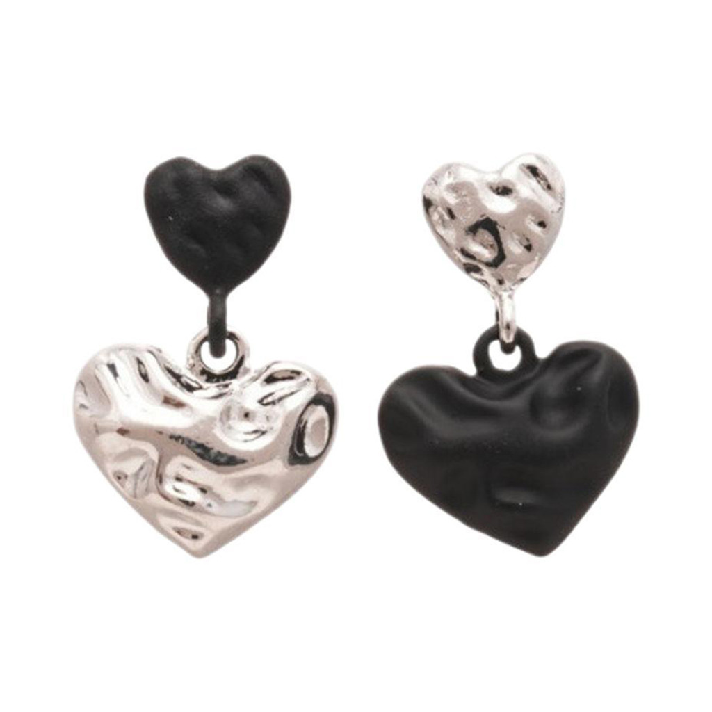 ต่างหูจี้รูปหัวใจสีดำและสีเงินแบบไม่สมมาตร สไตล์ย้อนยุคทำจากโลหะ