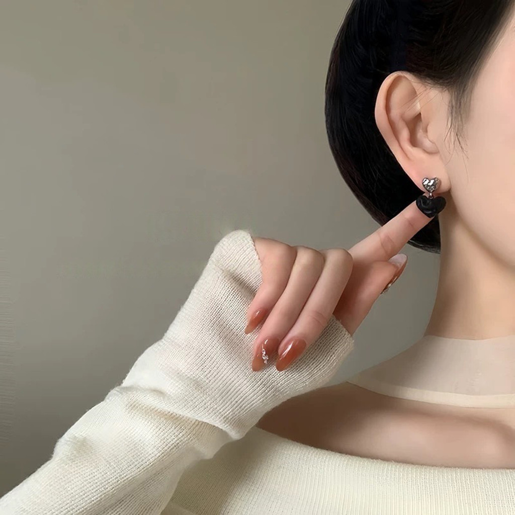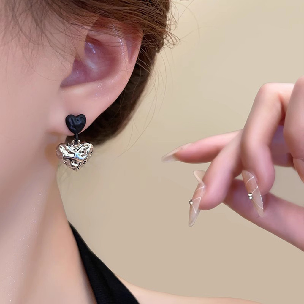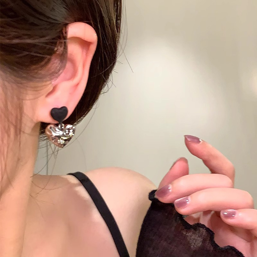 ต่างหูจี้รูปหัวใจสีดำและสีเงินแบบไม่สมมาตร สไตล์ย้อนยุคทำจากโลหะ