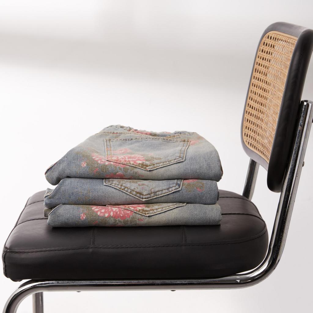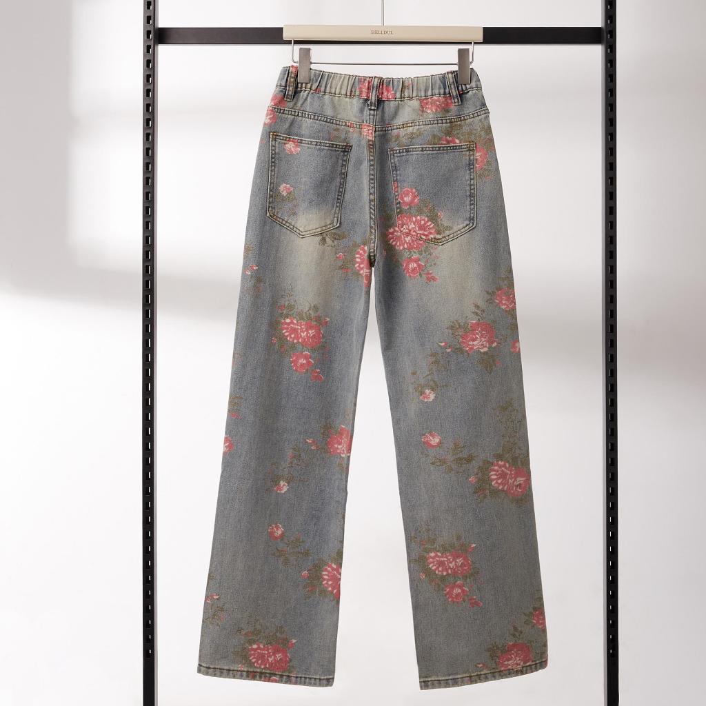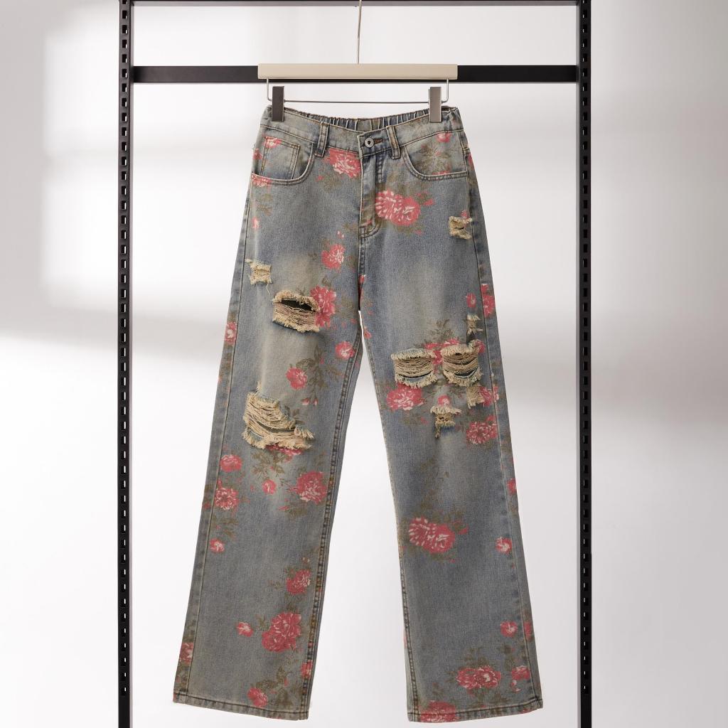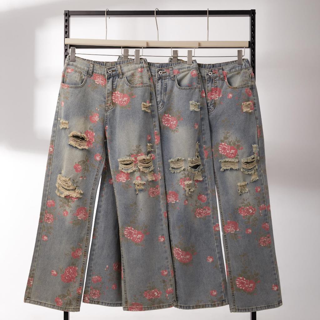 HELLDUL [9910] | กางเกงยีนส์ ทรงกระบอก เอวยืด ใส่สะบาย ลายดอกไม้ แต่งขาดขาหน้า