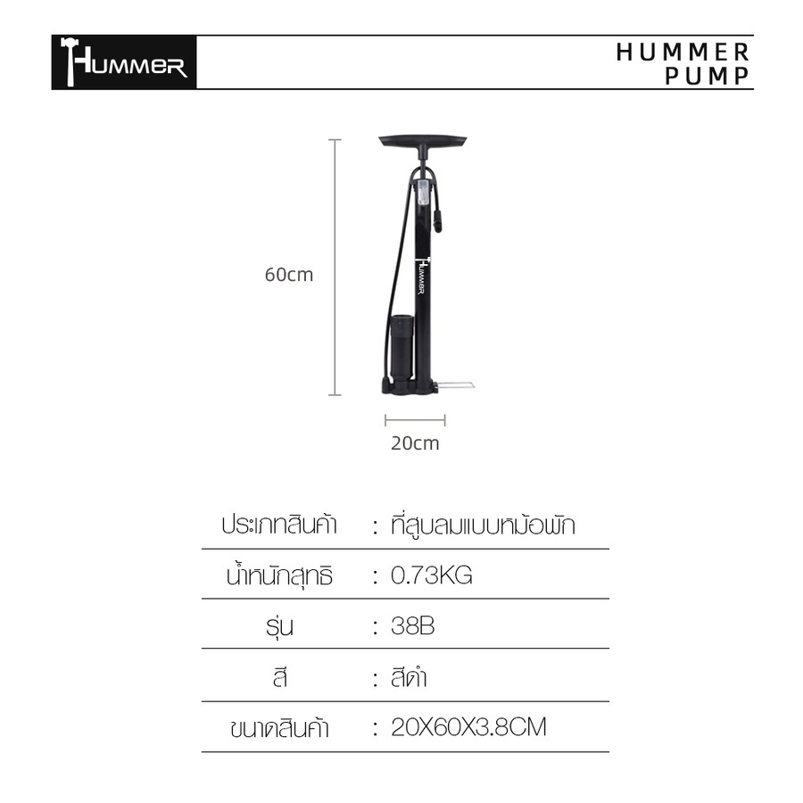 GlobalHouse HUMMER ที่สูบลมแบบหม้อพัก รุ่น38B ขนาด 20*3.8*59 ซม.สีดำ สินค้าของแท้คุณภาพดี