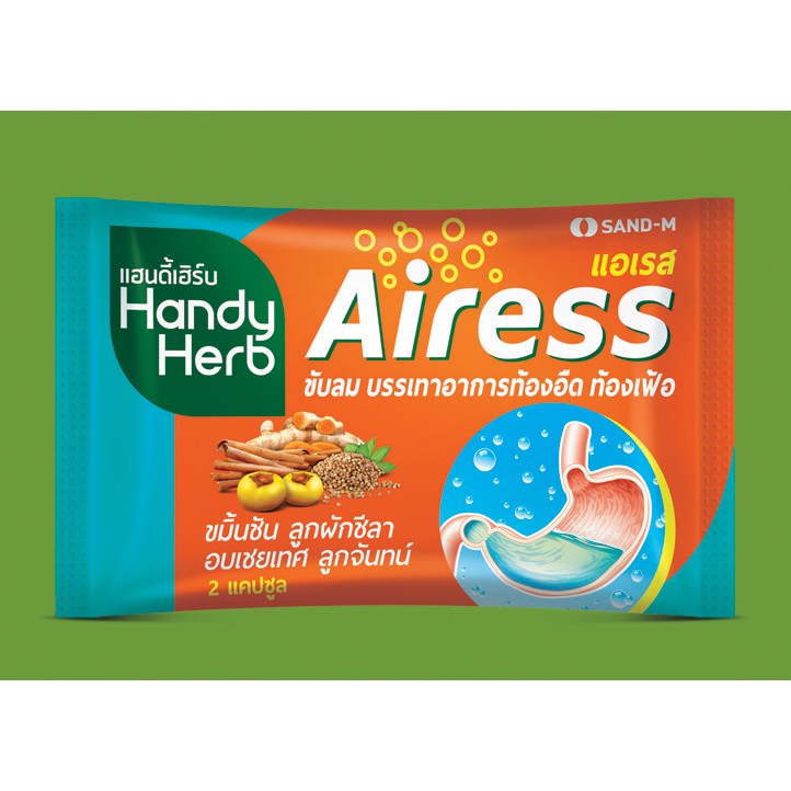 Handy Herb Airess แฮนดี้เฮิร์บ แอเรส ช่วยขับลม บรรเทาอาการท้องอืด ท้องเฟ้อ (2 แคปซูล/ซอง - 24 ซอง/กล่อง)