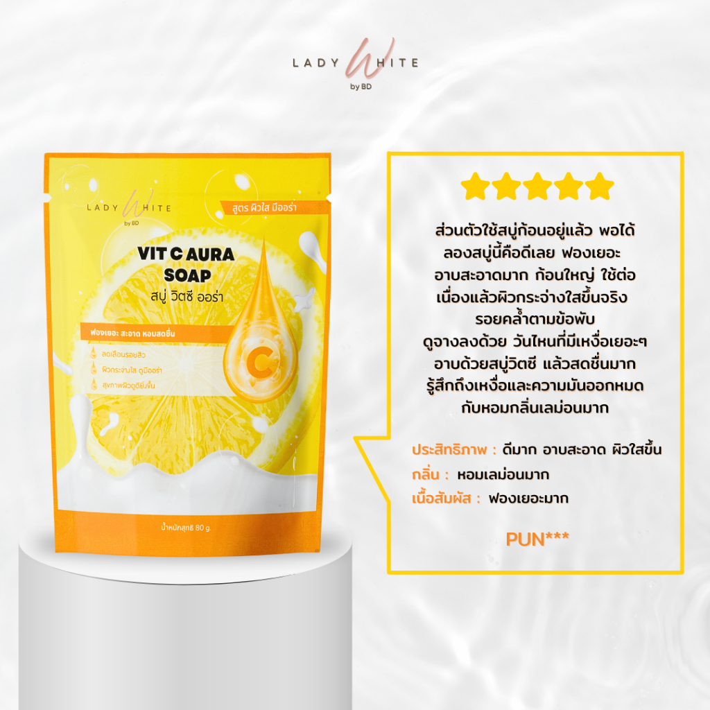 Lady White by BD สบู่ก้อนเลดี้ไวท์ วิตซี ออร่า ซองเหลือง สบู่ลดสิวผิวใส 80g สูตรผิวใส มีออร่า
