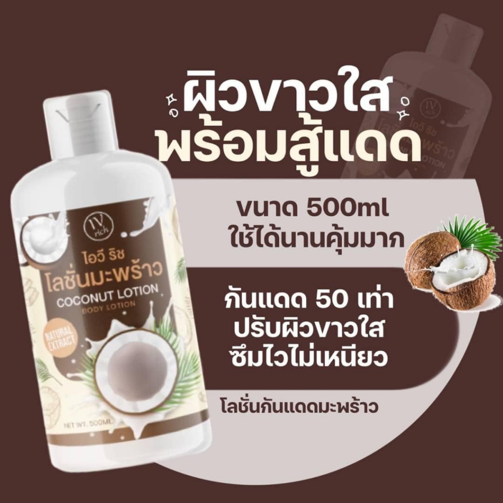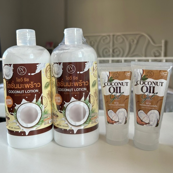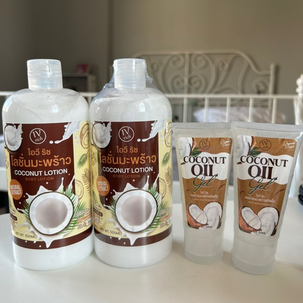เซ็ตโลชั่นกันแดดมะพร้าว 2 ขวด+เจลน้ำมันมะพร้าวสกัดเย็นของแท้ 2 หลอด ขาวทั้งหน้าทั้งตัว ใช้คุ้ม 3-5 เดือน ไอวี ริช