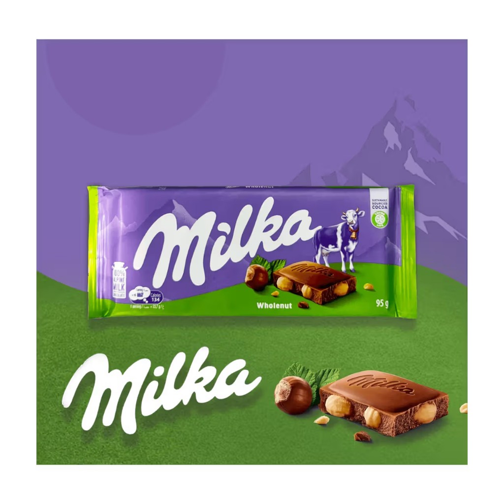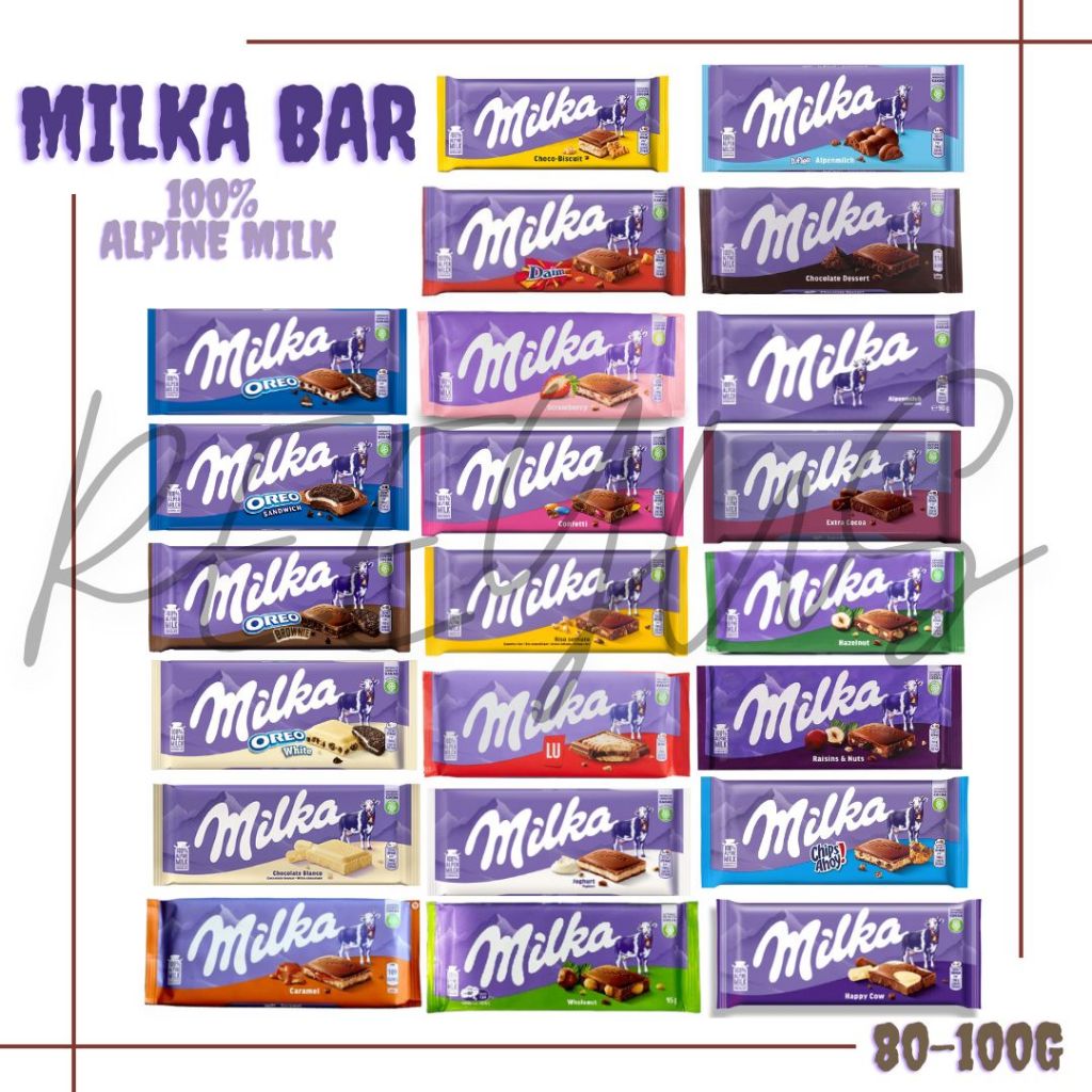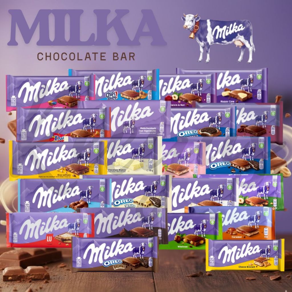 Milka Milk Chocolate bar มีส่วนผสมของนม Alpen 100% น้ำหนัก 80-100 กรัม มี 22 รส สินค้าจากเยอรมัน