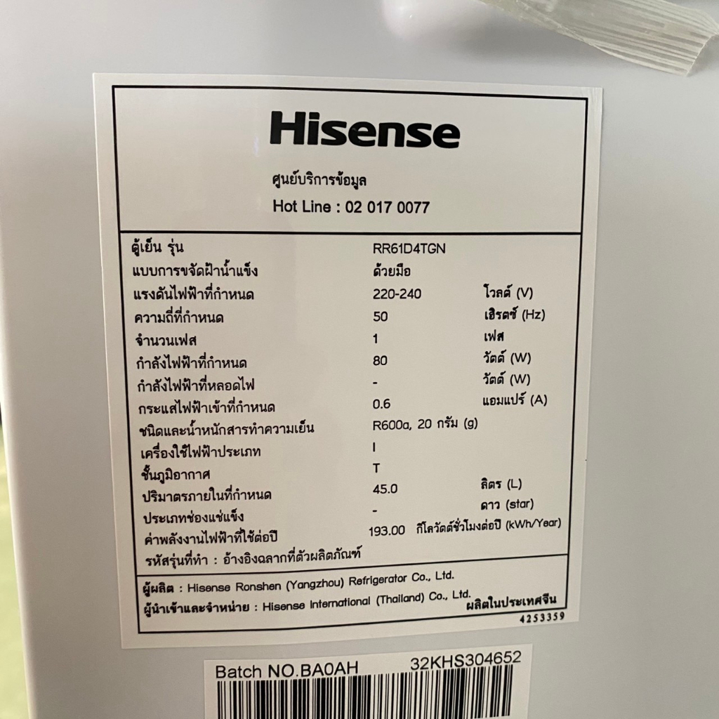 HISENSE ตู้เย็น 1 ประตู 1.6 คิว ความจุ 45 ลิตร รุ่นRR61D4TGN