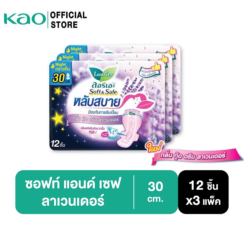 [แพ็ค3] ลอรีเอะ หลับสบาย กลิ่นกู๊ดดรีมลาเวนเดอร์ แบบกลางคืน 30ซม12ชิ้น LaurierSofe&SafeGood DreamLavenderScent