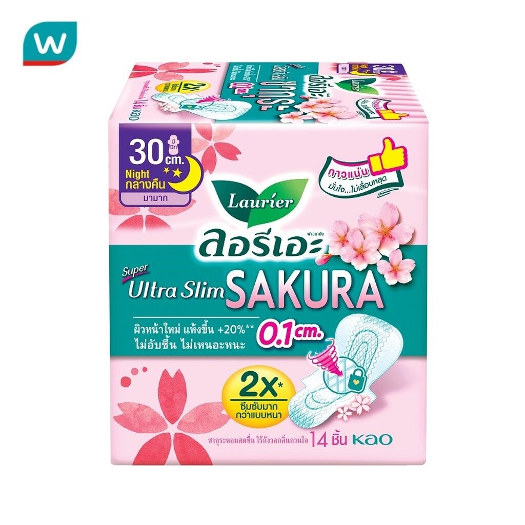 Laurier ลอริเอะ ผ้าอนามัย ซูเปอร์ อัลตร้า สลิม ซากุระ กลางคืน 30 ซม. มีปีก 14 ชิ้น