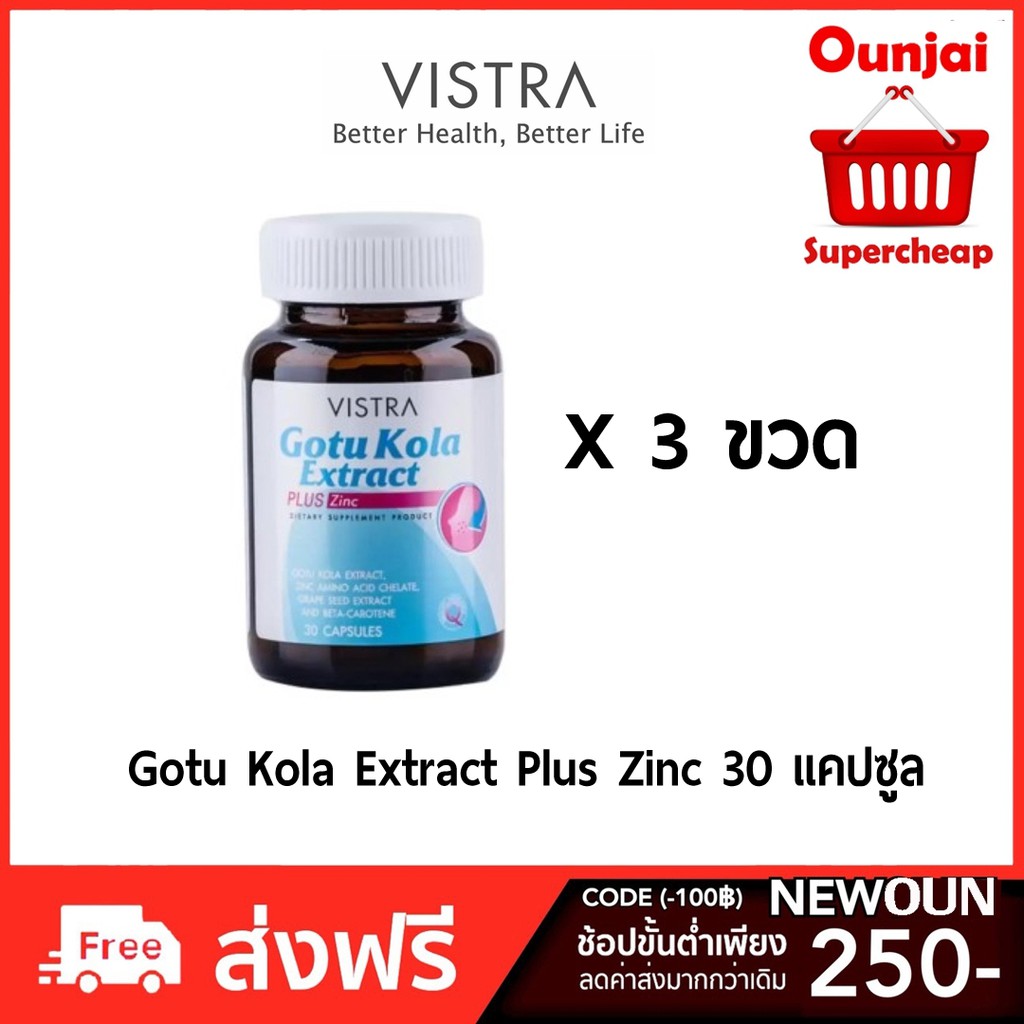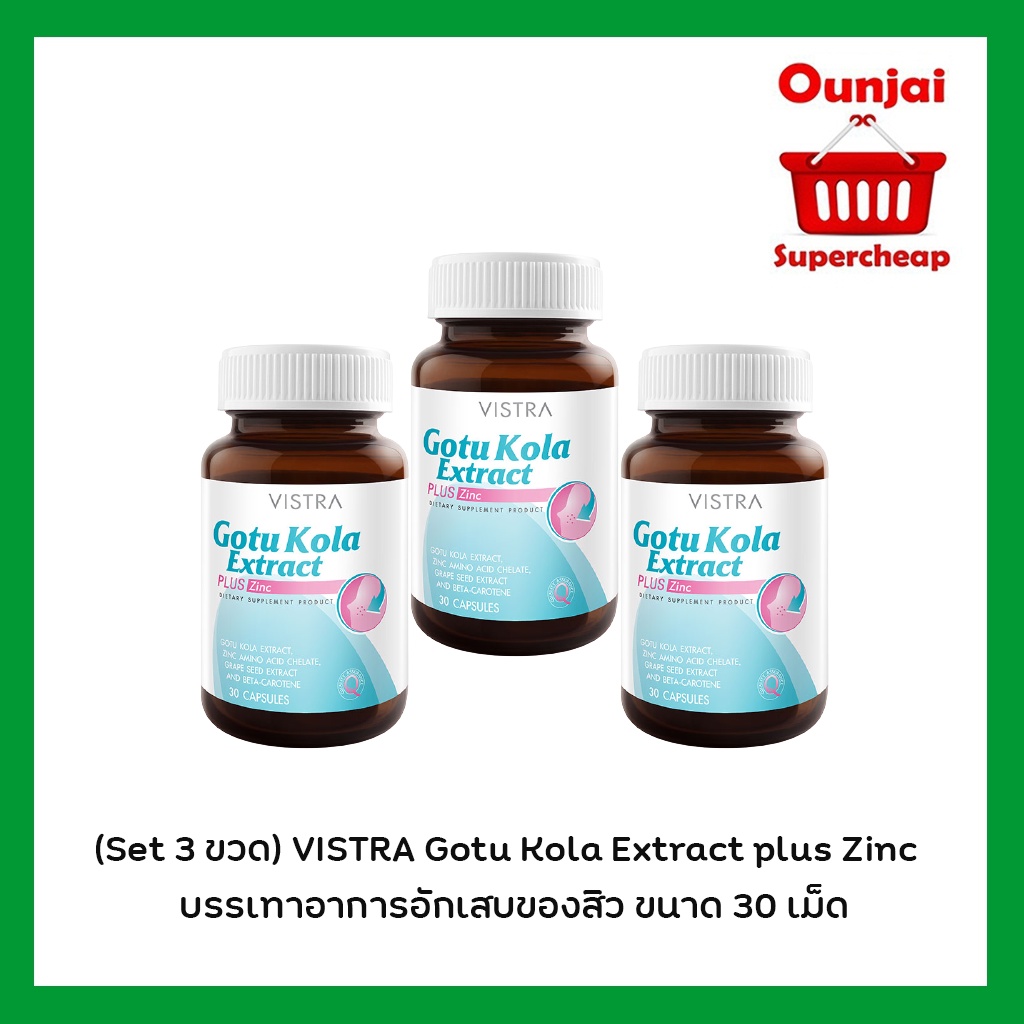 (Set 3 ขวด) VISTRA Gotu Kola Extract plus Zinc สารสกัดจากใบบัวบก บรรเทาอาการอักเสบของสิว ขนาด 30 เม็ด
