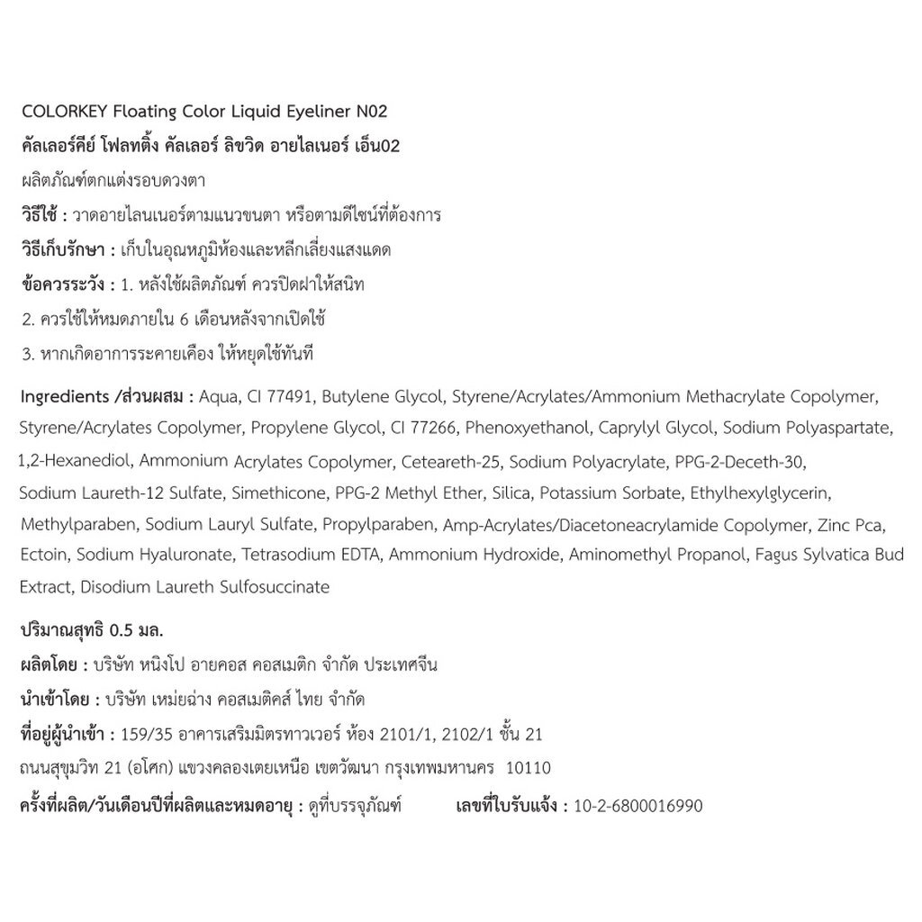 Colorkey คัลเลอร์คีย์ โฟลทติ้ง คัลเลอร์ ลิขวิด อายไลเนอร์ 0.5มล. N02 บราวน์ คอฟฟี่