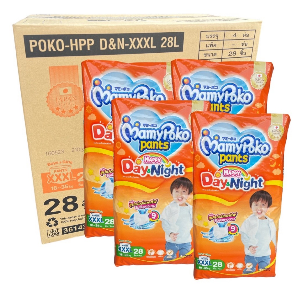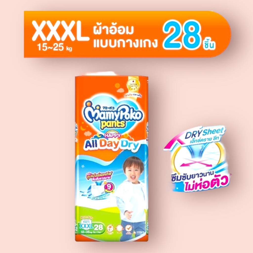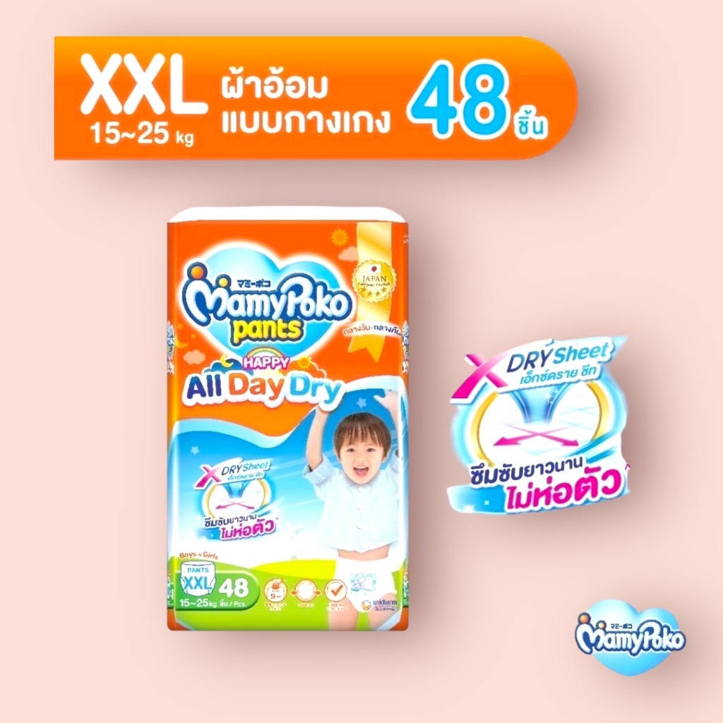 มามี่โปะโกะเดย์แอนด์ไนท์ MamyPoko Pants all day dry มามี่ส้ม (แพ็ค4ห่อ)S,M,L,XL,XXL" XXXL