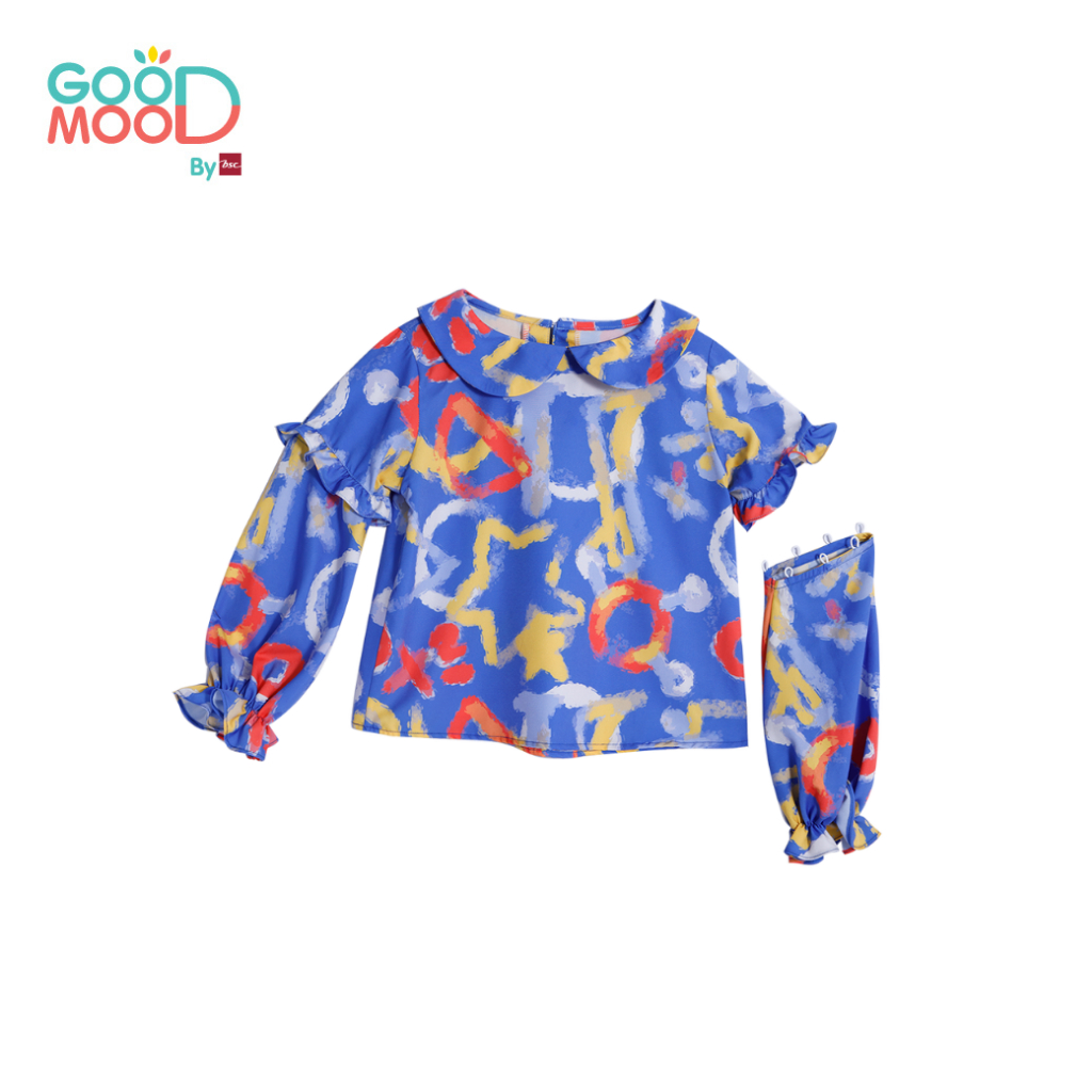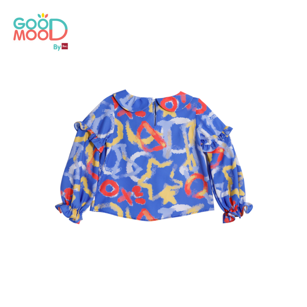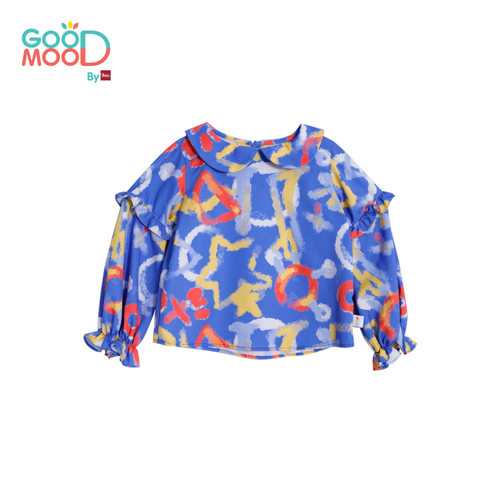 Good Mood by bsc เสื้อแขนยาว คอปกบัว ถอดแขนได้ พิมพ์ลายสีน้ำเงิน สำหรับเด็กอายุ 6-7 ปี ผ้าไหมอิตาลี่