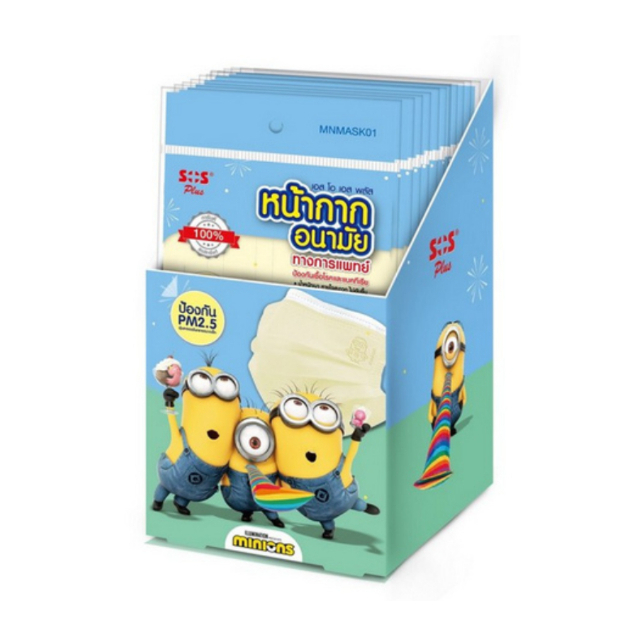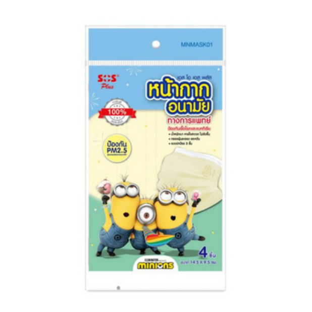 SOS Plus หน้ากากอนามัย ลายมินเนี่ยน สีเหลือง 12ซอง/กล่อง (ซองละ4ชิ้น)