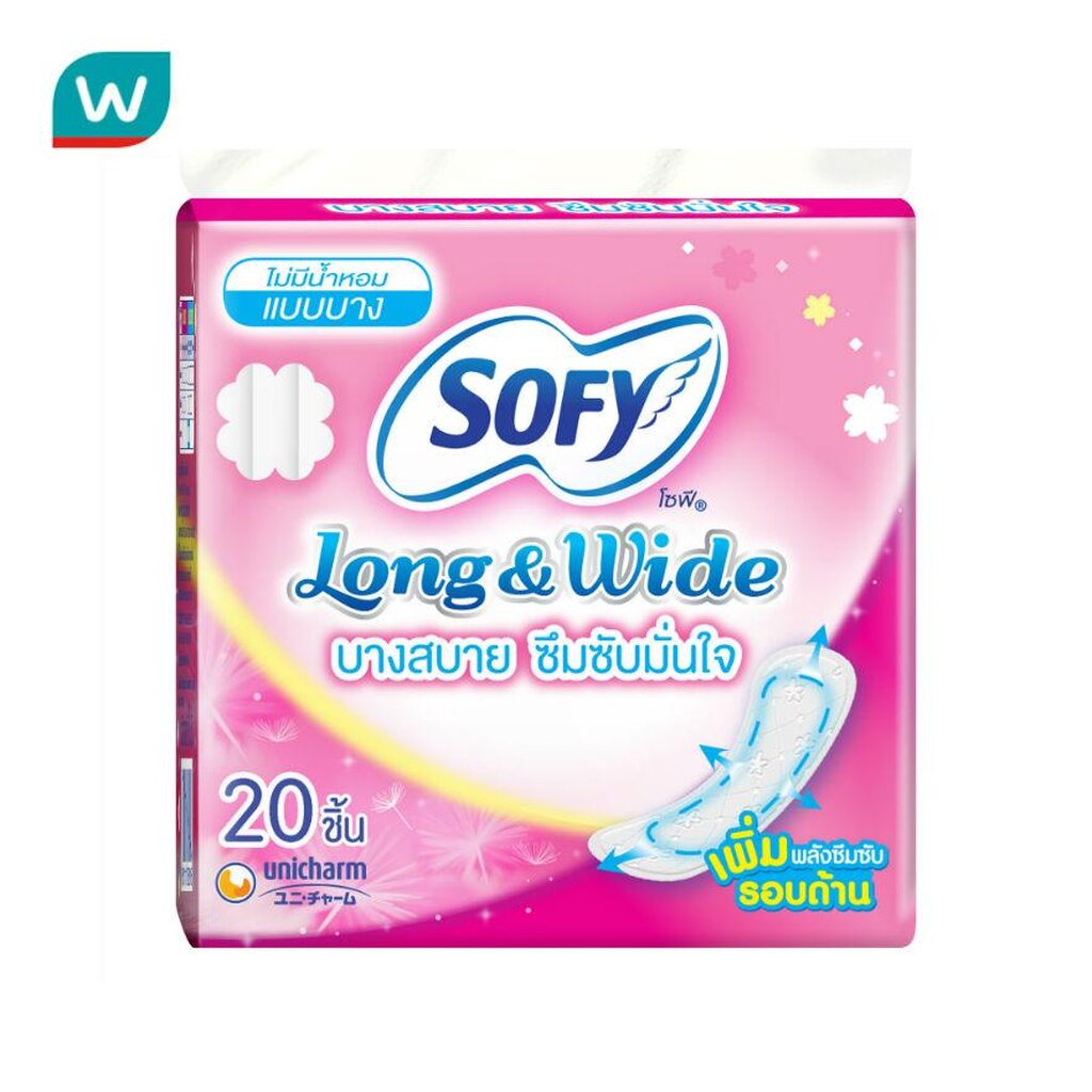 Sofy โซฟี แผ่นอนามัย ลอง แอนด์ ไวด์ แบบบาง ไม่มีน้ำหอม 20 ชิ้น