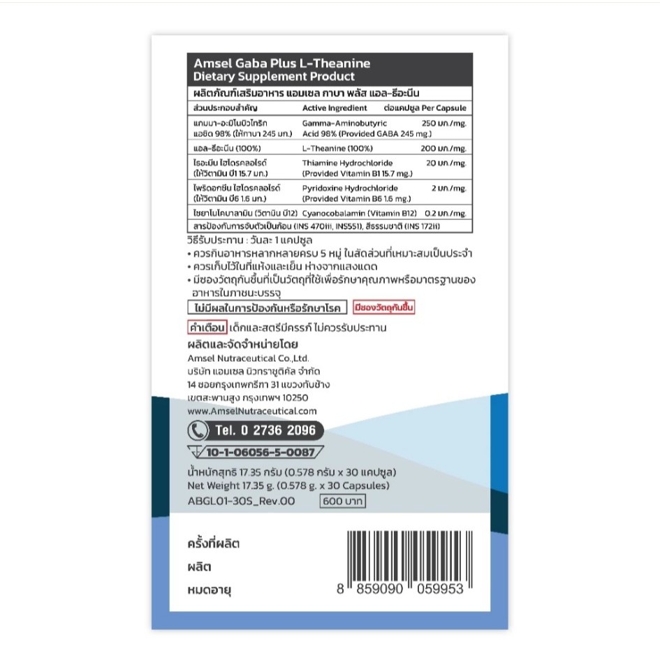 [โฉมใหม่] Amsel Gaba Plus L-Theanine บำรุงสมอง ความจำ ปรับสมดุล (30 แคปซูล X2 ขวด)
