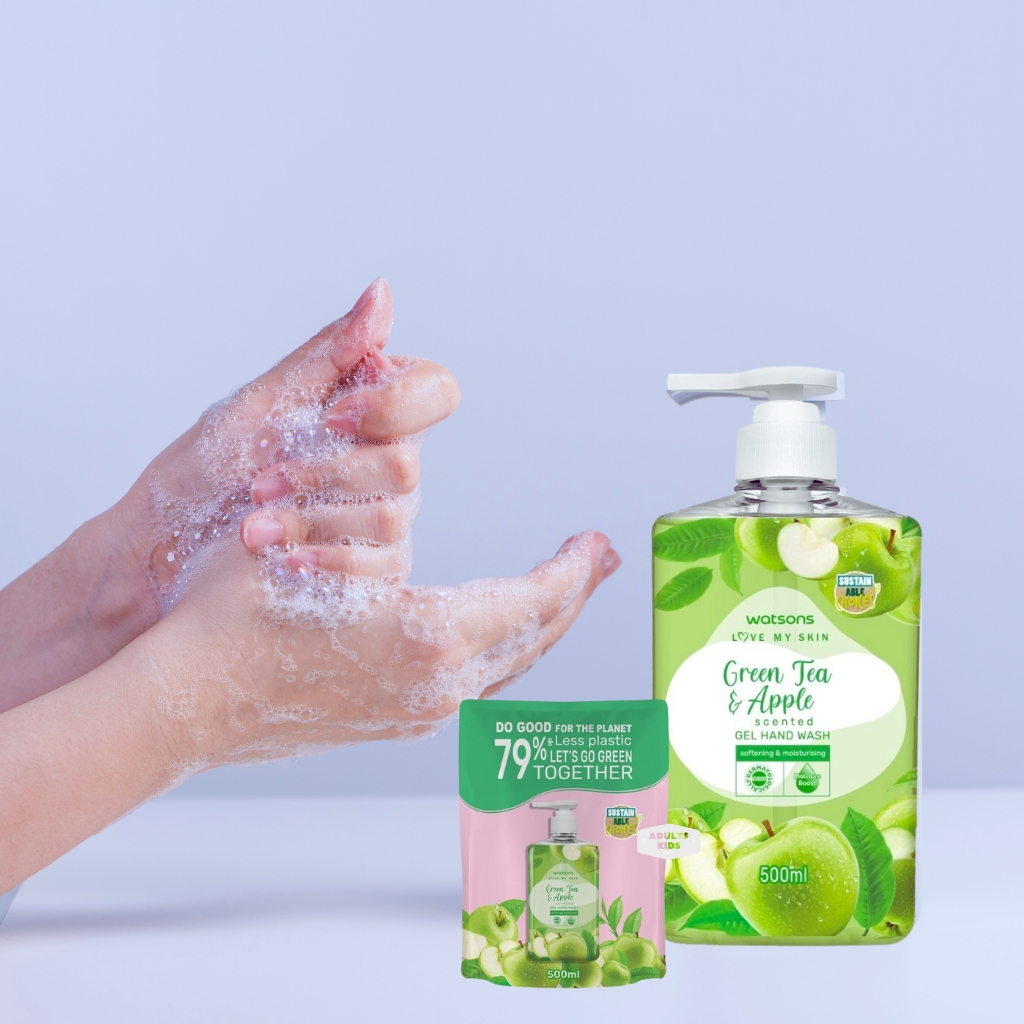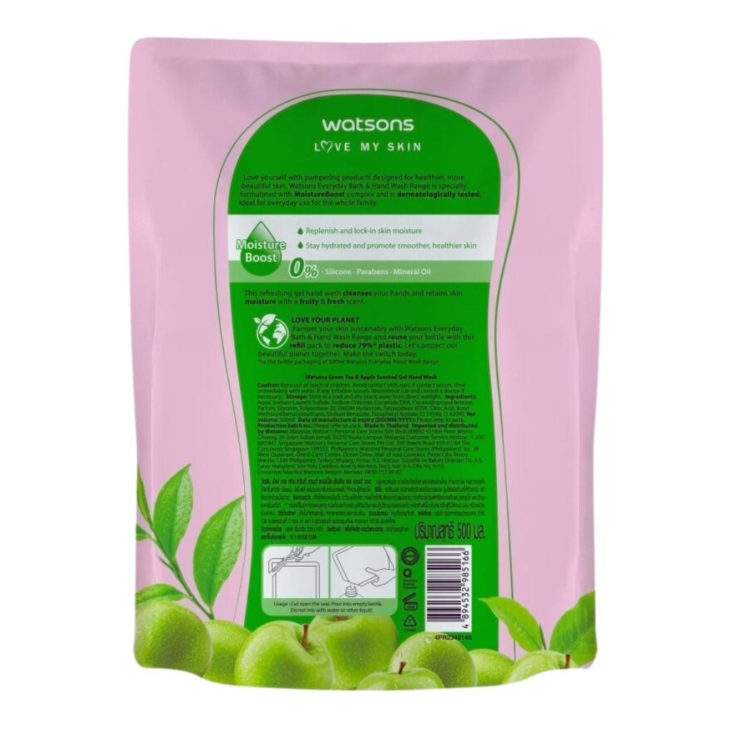 WATSONS วัตสัน สบู่เหลวล้างมือ เลิฟ มาย สกิน กรีนที แอนด์ แอปเปิ้ล เซ็นทิด เจล แฮนด์ วอช 500 มล.(รีฟิล)