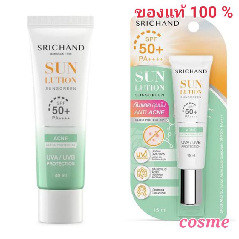 แบบหลอด Srichand Sunlution Skin Sunscreen SPF50 ศรีจันทร์ ซันโซลูชั่น กันแดด หลอด 15 มล และ 40 มล.