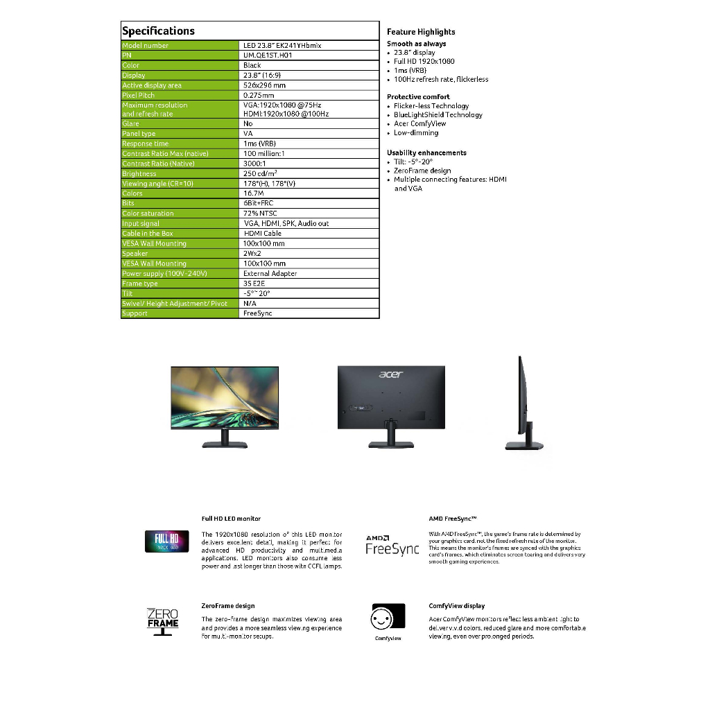 ACER Monitor รุ่น EK241YHbmix 23.8" VA (1080p,HDMI,VGA,SPK) / 1MS/ 100Hz/ sRGB 72% ประกันศูนย์เอเซอร์ 3 ปี