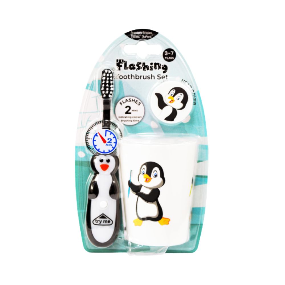 DR.PHILLIPS ชุดแปรงสีฟันสำหรับเด็ก อายุ 3-7 ปี พร้อมแก้วและฝาครอบแปรง ลายเพนกวิน (คละสี)