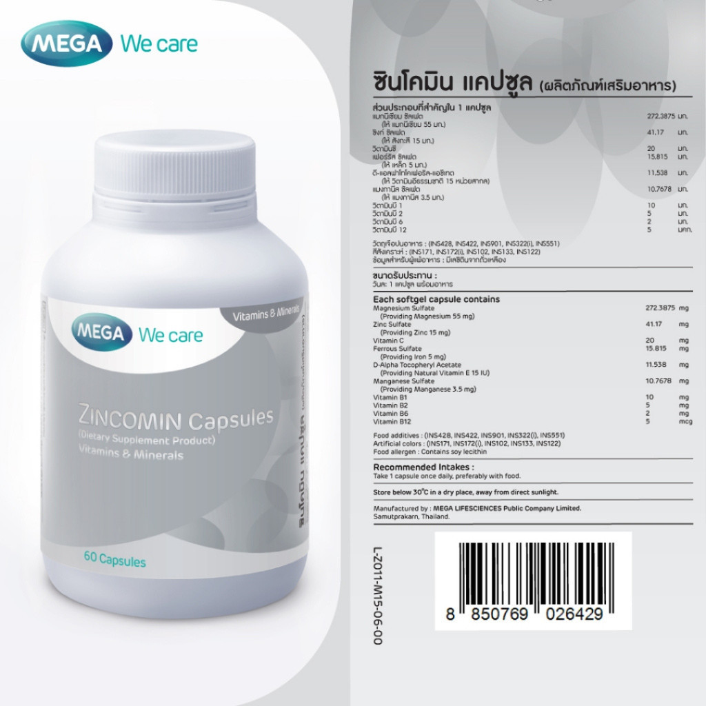 MEGA We care เมก้าวีแคร์ ZINCOMIN Capsules ซินโคมิน แคปซูล 60 แคปซูล [PC]