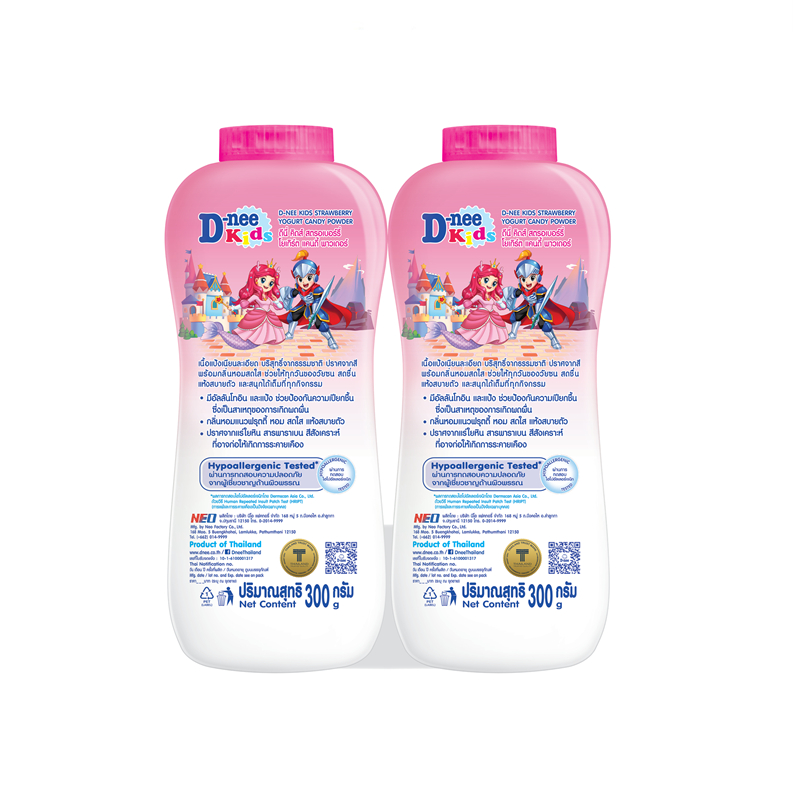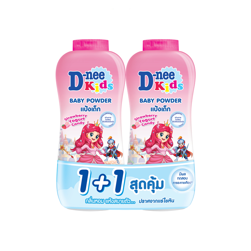 [แพ็คคู่] D-nee ดีนี่ คิดส์ แป้งเด็ก กลิ่นสตรอเบอร์รี่ โยเกิร์ต แคนดี้ 300+300 กรัม.
