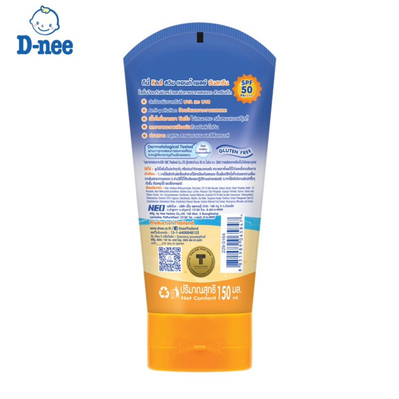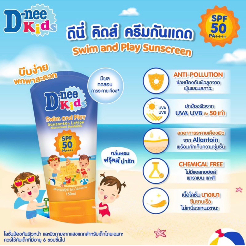 โฉมใหม่!D-nee kids ดีนี่ คิดส์ สวิม แอนด์ เพลย์ ซันสกรีน โลชั่น SPF 50 ขนาด 150 มล 1 หลอด