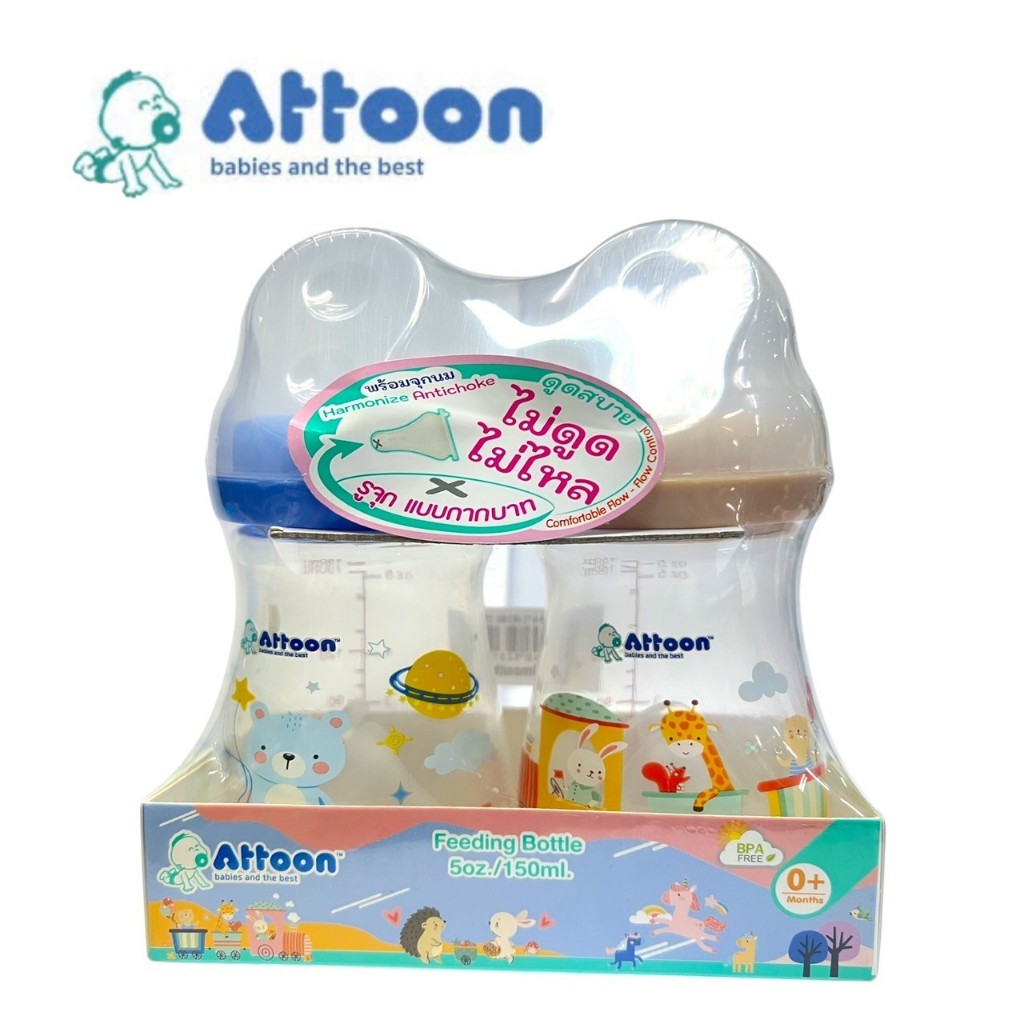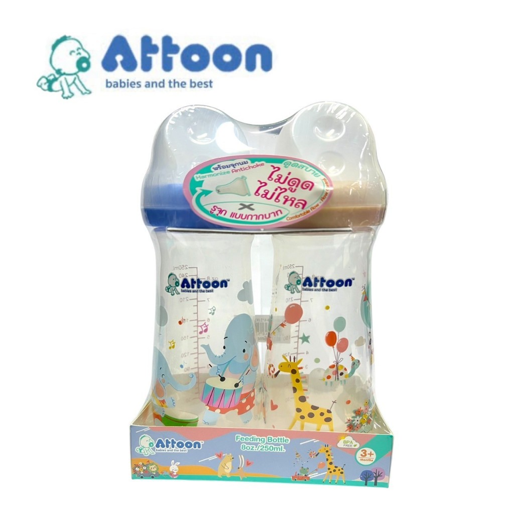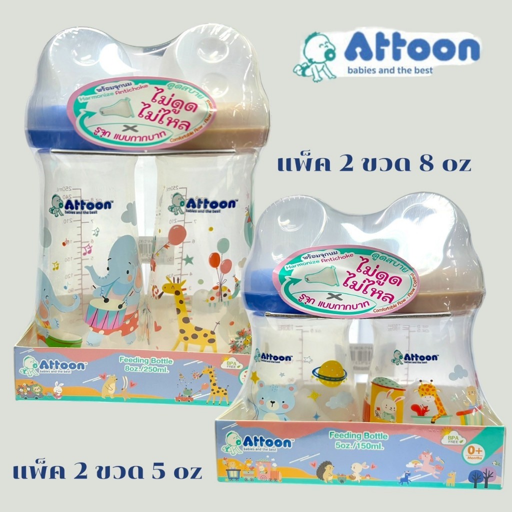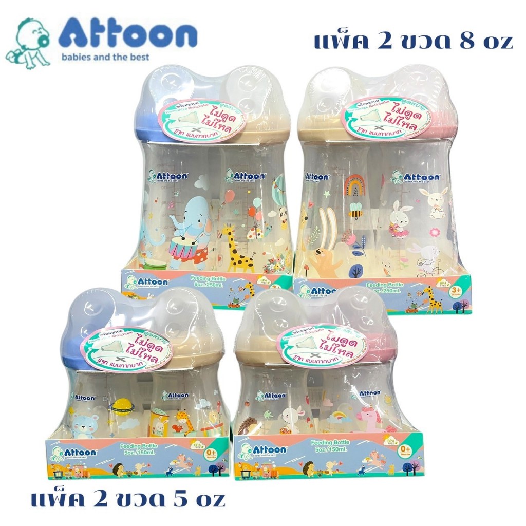 ATTOON ขวดนมคอแคบแพ็ค2ขวด พร้อมจุก Antichoke ไม่ดูดไม่ไหล ขนาด 5oz และ 8oz