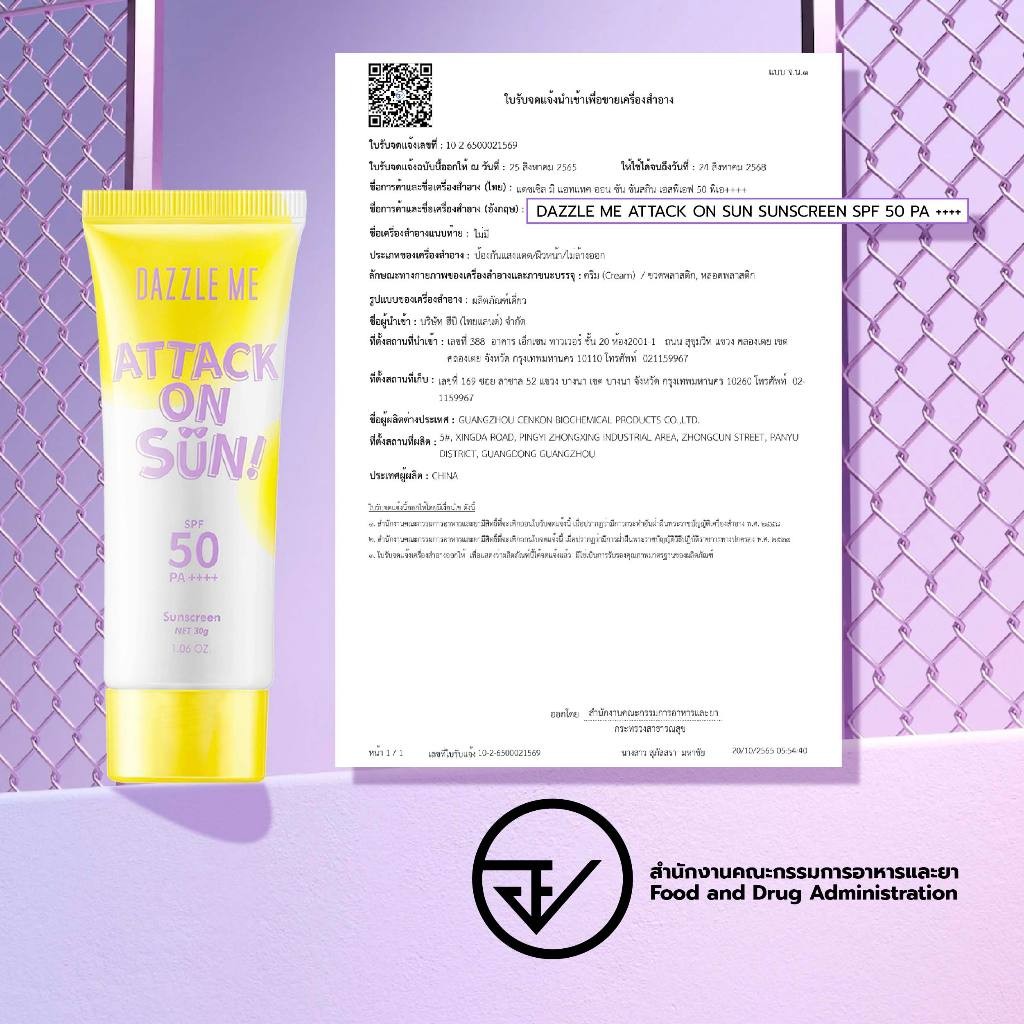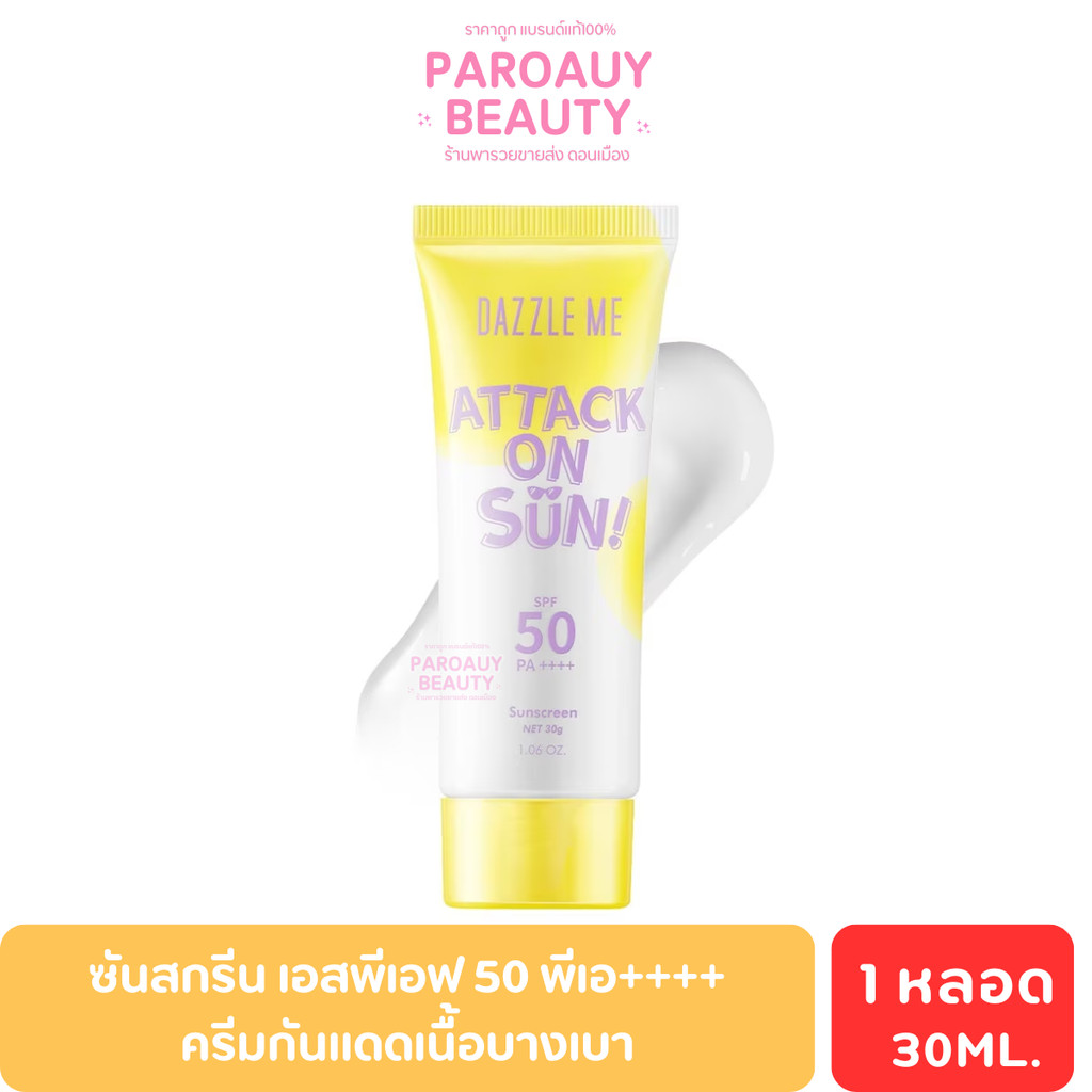 ครีมกันแดดเนื้อบางเบา DAZZLE ME Attack on Sun! Sunscreen SPF 50 PA++++ เนื้อบางเบา ซึมซาบเร็ว