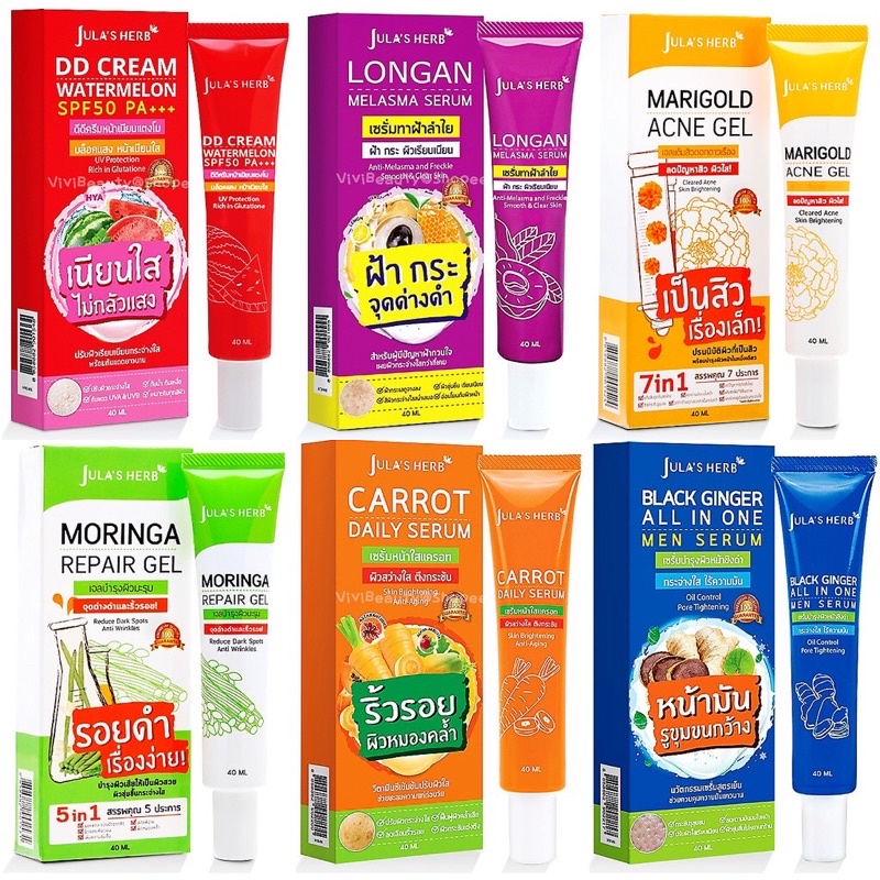 จุฬาเฮิร์บ แบบหลอด 40 ml มี 7 สูตร DDแตงโม, เจลมะรุม, แต้มสิวดาวเรือง, ลำใยแก้ฝ้า, เซรั่มแครอท, เซรั่มขิงดำ Jula's Herb