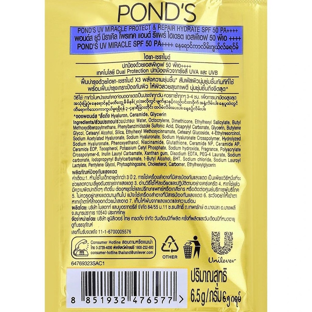 1 กล่อง 6 ซอง พอนด์ส ยูวี มิราเคิล โพรเทค แอนด์ รีแพร์ ไฮเดรต SPF50 PA++++ 6.5 ก. x 1 กล่อง