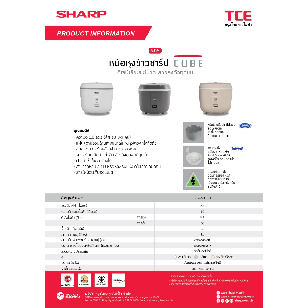 SHARP หม้อหุงข้าว CUBE 1.8 ลิตร รุ่น KS-PR18ET เคลือบเทฟล่อน (ของแท้รับประกันศูนย์ชาร์ปนาน 3 ปี)