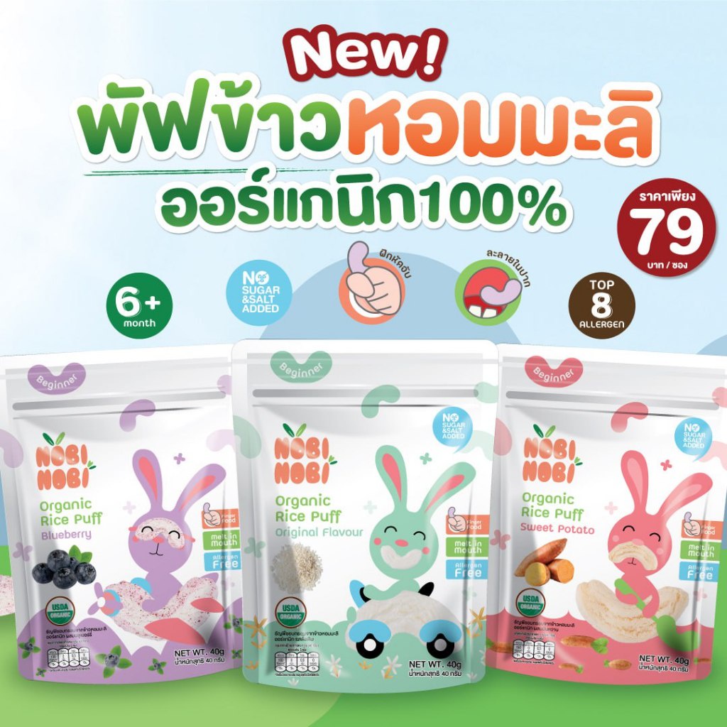 Nobi Nobi โนบิโนบิ ขนมข้าวหอมมะลิออร์แกนิกและพัฟ 15g 40g ขนมเด็ก แคลเซี่ยมสูง ขนมสำหรับเด็ก 6M+