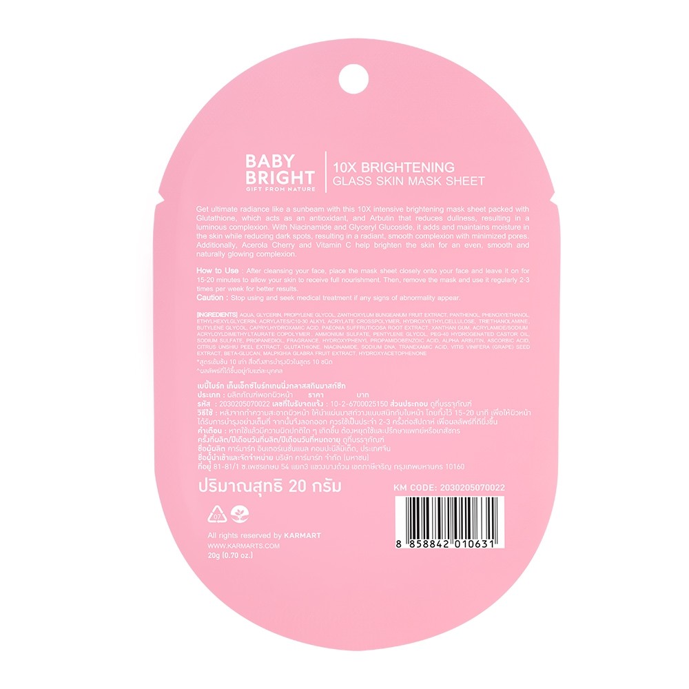 Baby Bright 10X Hydrating / Brightening Glass Skin Mask Sheet 20g เบบี้ไบร์ท มาร์คหน้า มาสก์ผิวกระจก