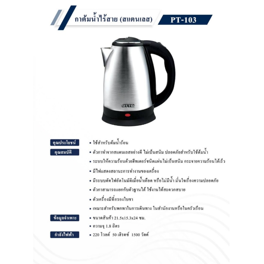 OTTO รุ่น PT-103 กาต้มน้ำไฟฟ้าไร้สาย ความจุ 1.8 ลิตร 1500วัตต์