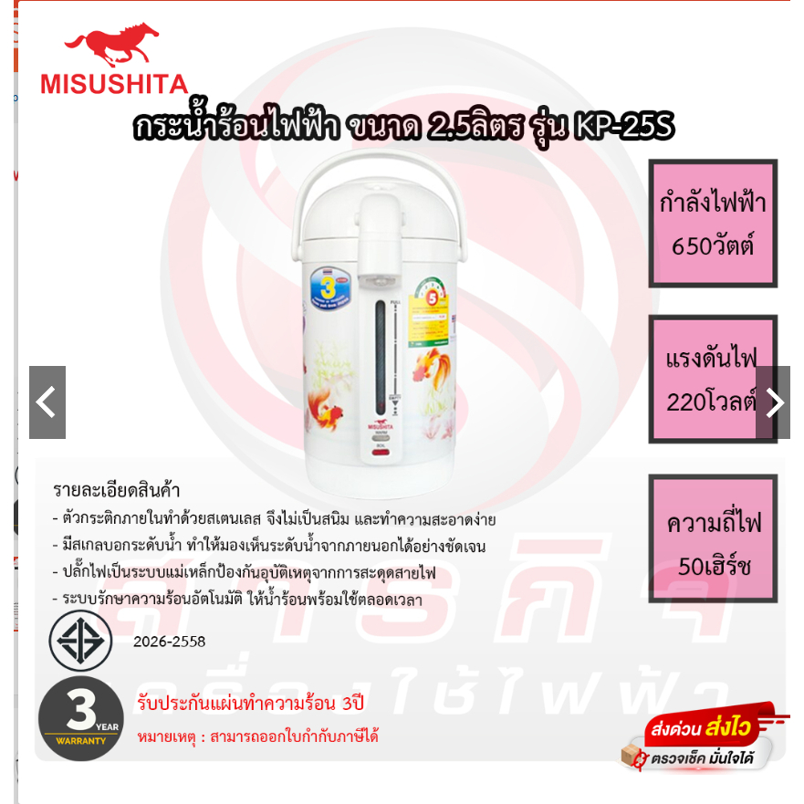 กระติกน้ำร้อนมิซูชิต้า Misushita ขนาด 2.5ลิตร รุ่นKP-25S รับประกันนาน 3ปี เสียเปลี่ยนเครื่องใหม่