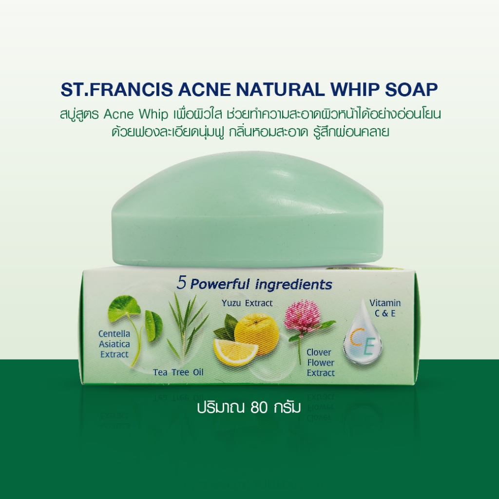[CLEARANCE] [แพ็ก 3 ก้อน] ST.FRANCIS สบู่ล้างหน้า Acne Whip Soap 80g สูตรอ่อนโยน ลดสิว ผิวใส ไม่แห้งตึง