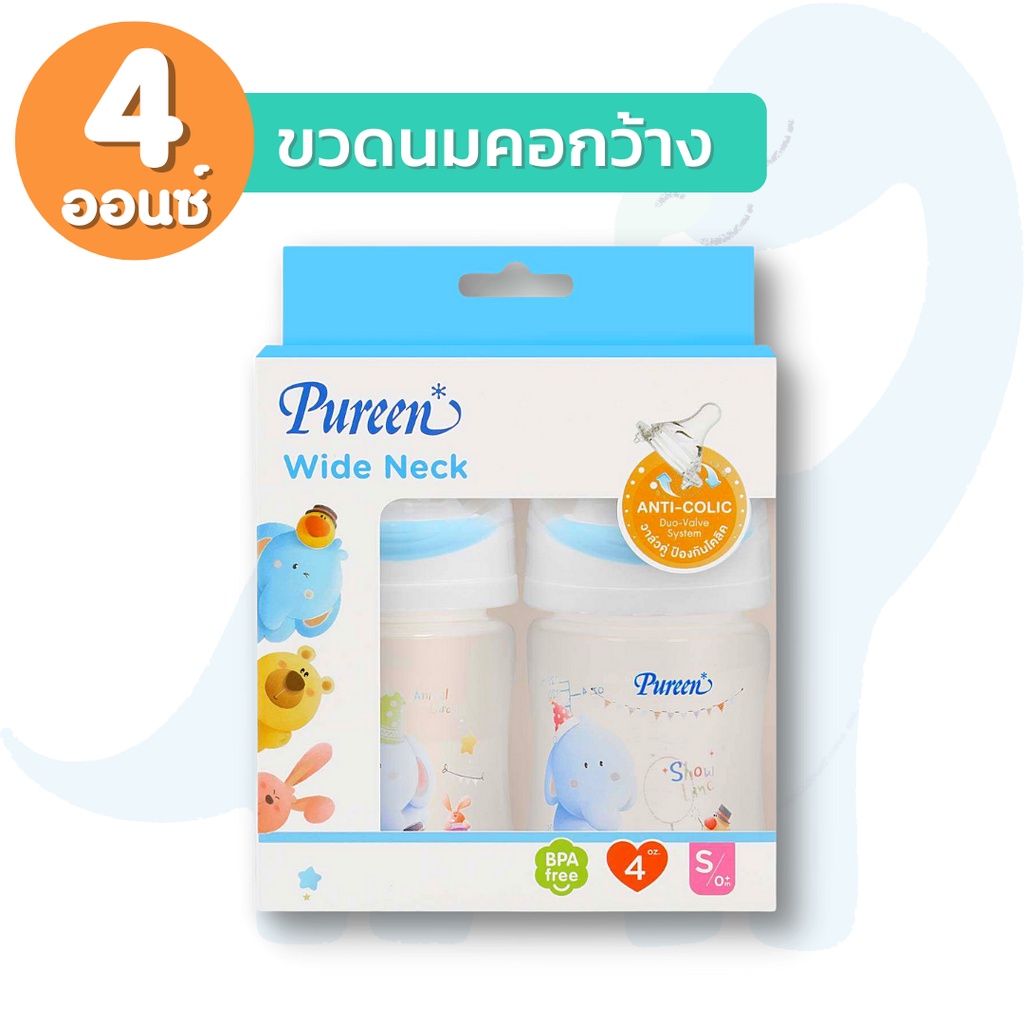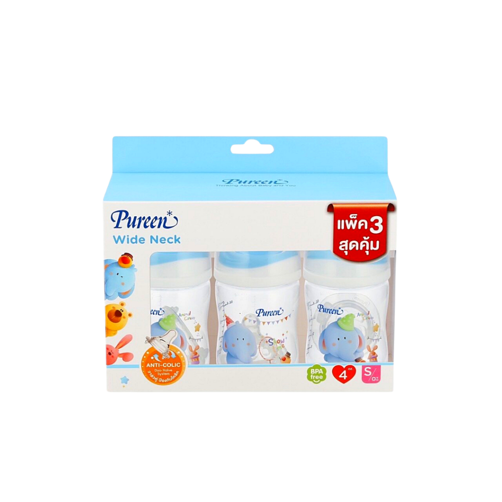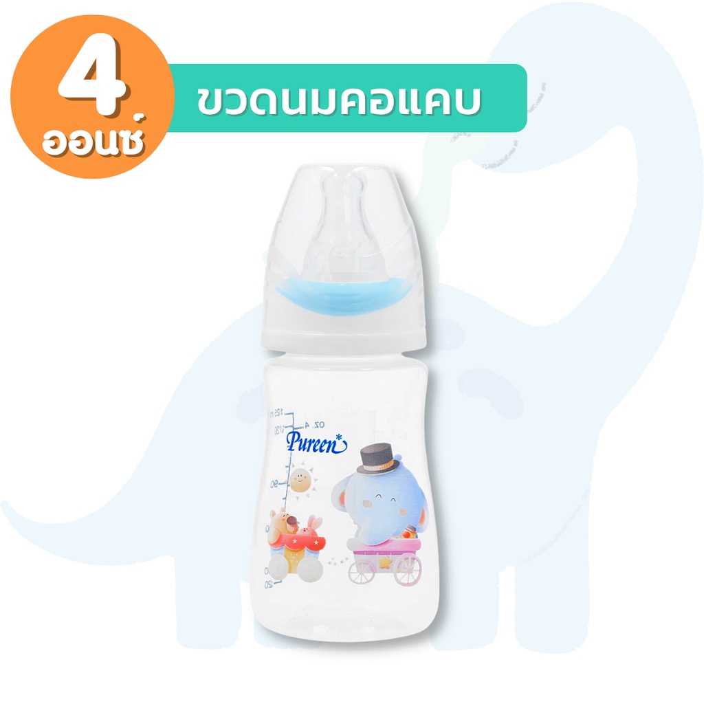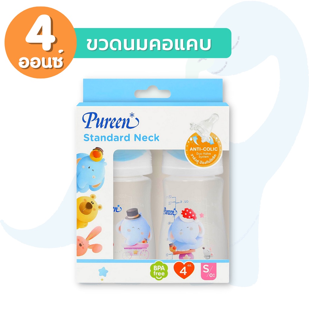 Pureen เพียวรีน ขวดนมคอกว้าง ขวดนมคอแคบ ลายการ์ตูน (ขนาด 4/8 ออนซ์) พร้อมจุกนมลดอาการโคลิค