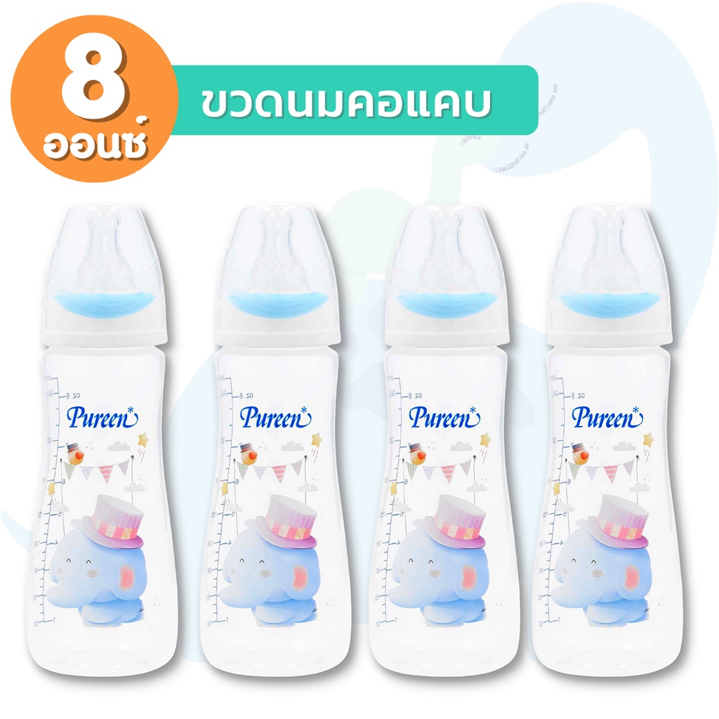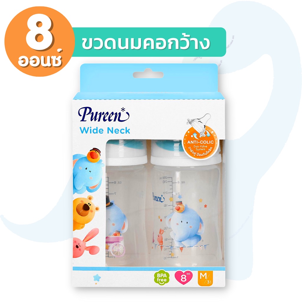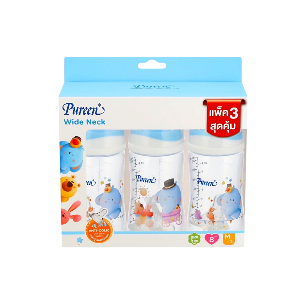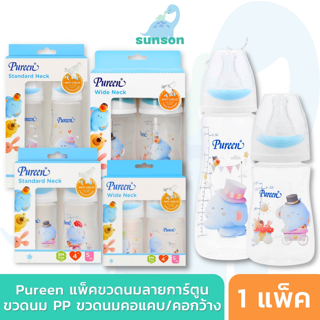 Pureen เพียวรีน ขวดนมคอกว้าง ขวดนมคอแคบ ลายการ์ตูน (ขนาด 4/8 ออนซ์) พร้อมจุกนมลดอาการโคลิค
