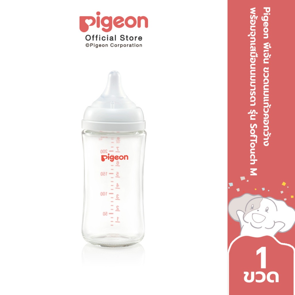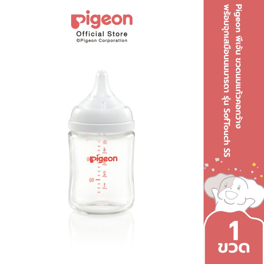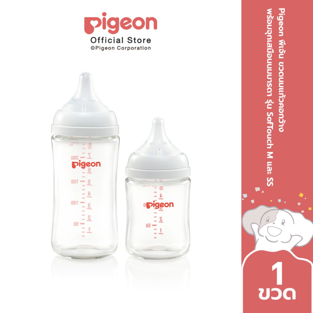 Pigeon พีเจ้น ขวดนมแก้วรุ่นคอกว้าง จุกซอฟท์ทัช 5ออนซ์ และ 8ออนซ์